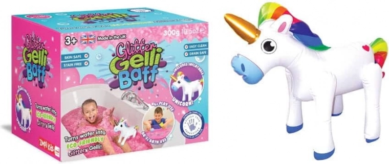 Le pack comprend également une adorable licorne gonflable, pour parfaire l’ambiance magique. Le produit est certifié biodégradable, facile à rincer et ne tache ni la peau ni la baignoire.