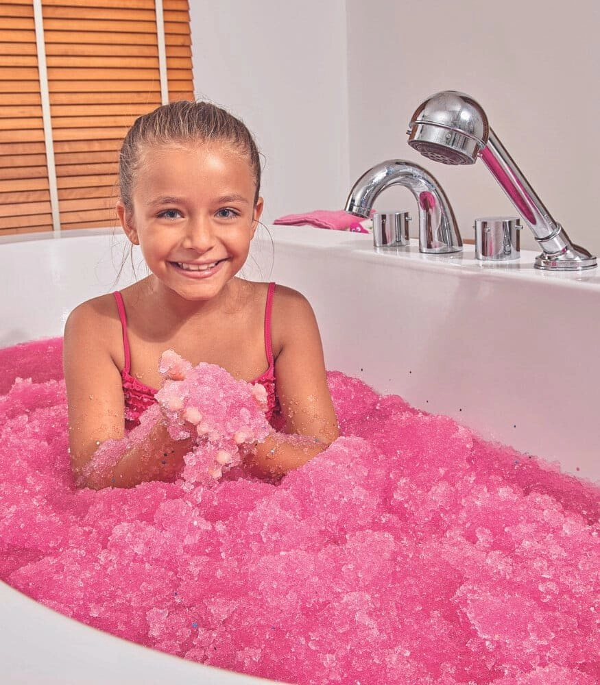 Il suffit de verser la poudre dans le bain et, en quelques instants, vous obtenez une gelée rose et scintillante que les enfants adorent. Un jeu sensoriel qui stimule la créativité et la motricité fine.