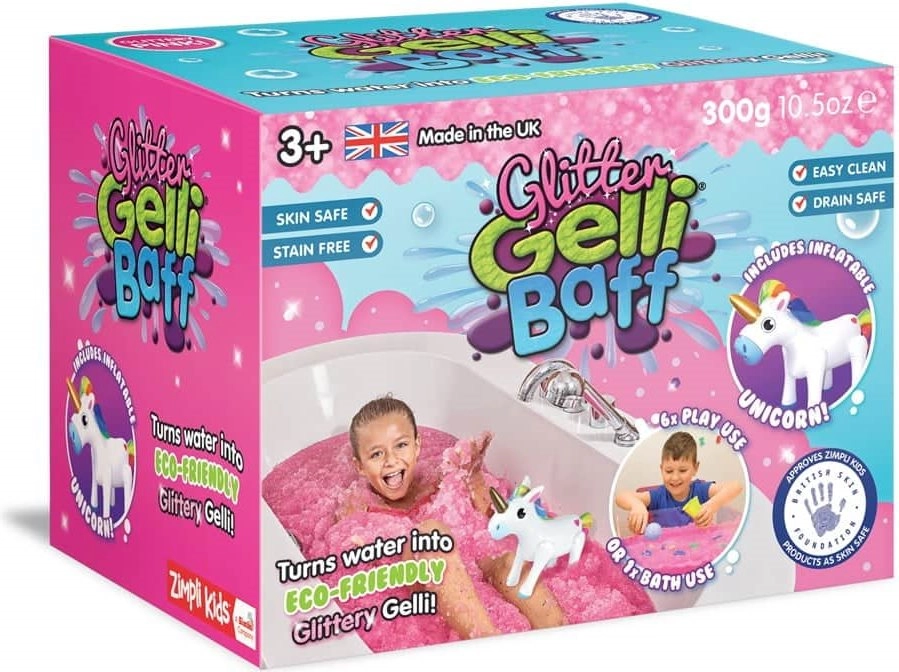 Glitter Gelli Baff offre aux enfants un plaisir sensoriel dans et hors de la baignoire. En quelques minutes, l’eau se transforme en une gelée épaisse, rose et pailletée, non toxique, sans produits chimiques nocifs et douce d’un point de vue dermatologique. À la fin du jeu, ajoutez l’agent de dissolution fourni et le gel redevient de l’eau, qui peut être évacuée en toute sécurité.