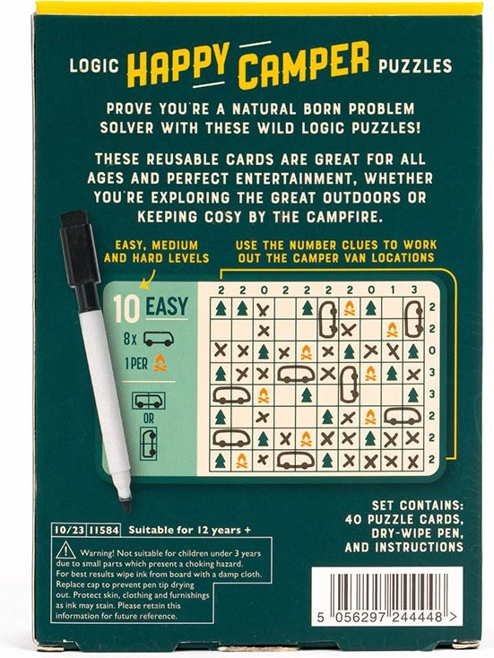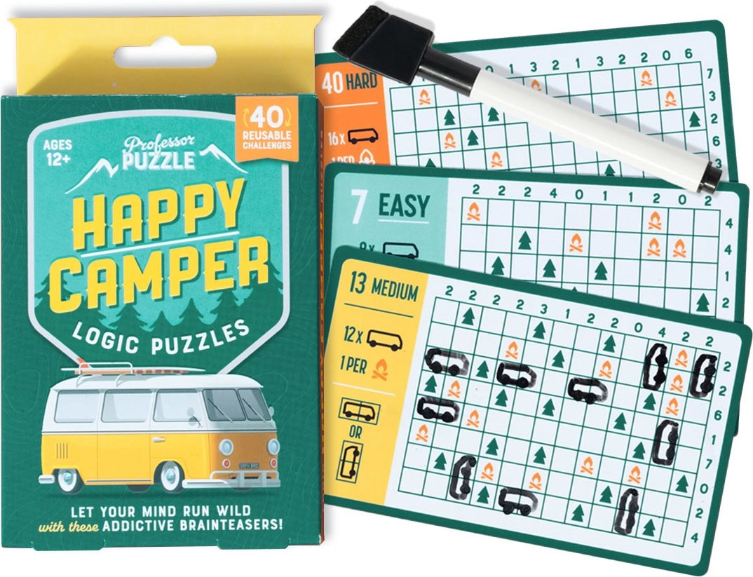 Partez à l’aventure avec le set Happy Camper Logic Puzzles de la marque PROFESSOR PUZZLE. Des cartes pratiques et réutilisables proposent 40 défis malins à différents niveaux de difficulté – de facile à difficile. Grâce au feutre effaçable à sec, vous pouvez écrire, résoudre et tout effacer directement sur les cartes pour recommencer à l’infini.