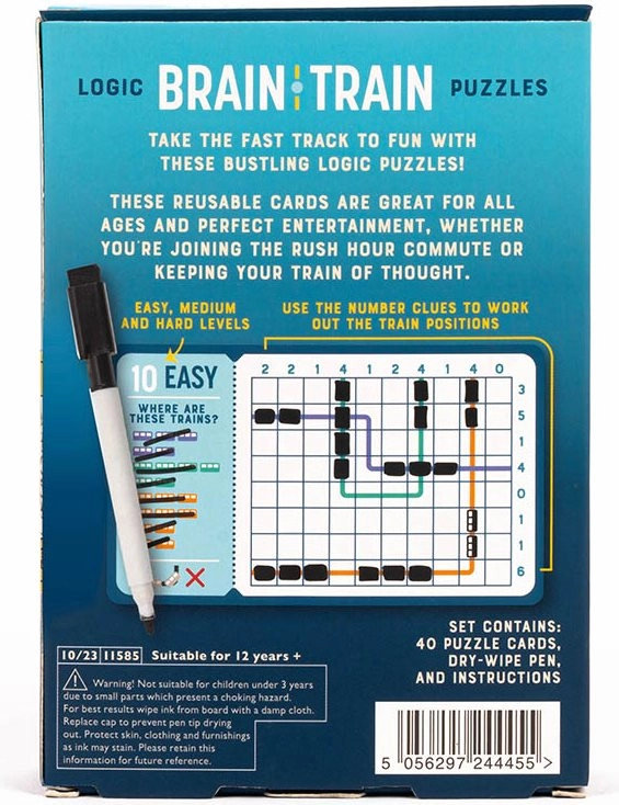 Découvrez des défis logiques captivants qui feront chauffer vos méninges tout en vous amusant. Le jeu Brain Train est conçu pour améliorer la pensée logique, la concentration et la créativité – dans un format compact à glisser dans un sac à main, un sac à dos ou une poche.