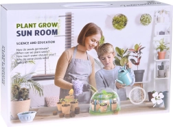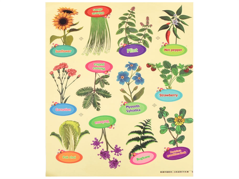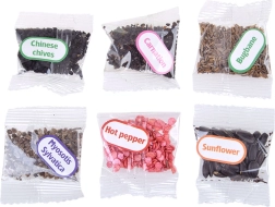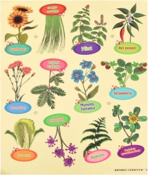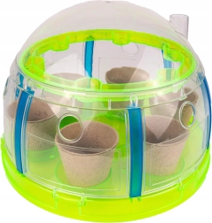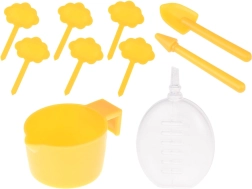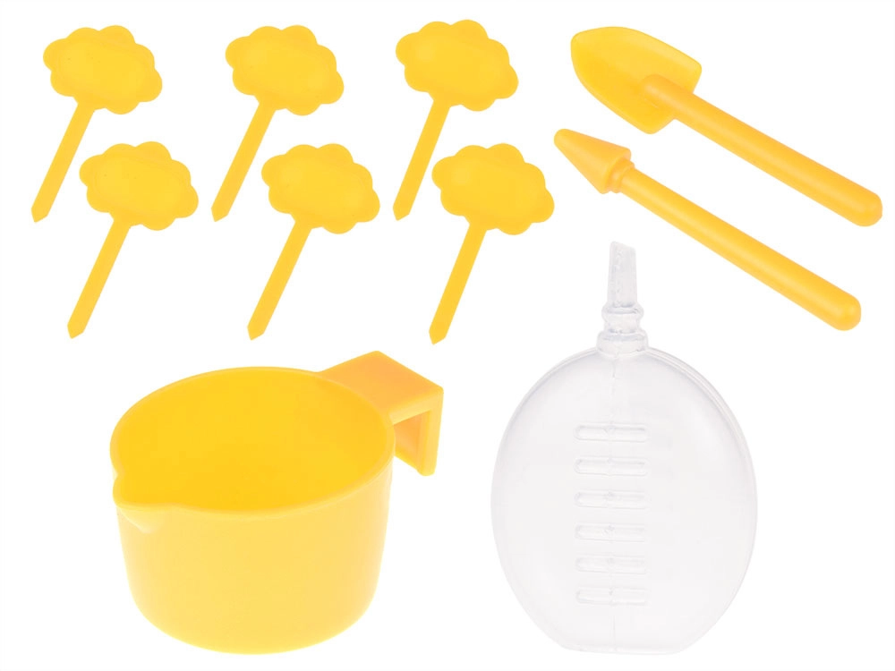 - 1× mini-serre, 6× pot biodégradable, 6× briquette de coco (Ø 30 mm), 6× étiquette pour identifier les plantes, 1× pelle, 1× plantoir, 1× gobelet d’arrosage, 1× lot d’autocollants (avec noms et images des plantes), 1× lot d’autocollants avec noms de plantes (en anglais), 6× sachet de graines (balsamine, tournesol, vivace, ciboulette, œillet, poivron), notice illustrée