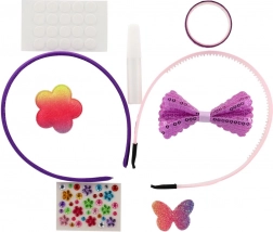 2 serre-têtes en plastique, assortiment de décorations (appliqués papillon, cœur, fleur, strass), pastilles autocollantes, petite colle; certains kits peuvent contenir un ruban/cordon ou un anneau