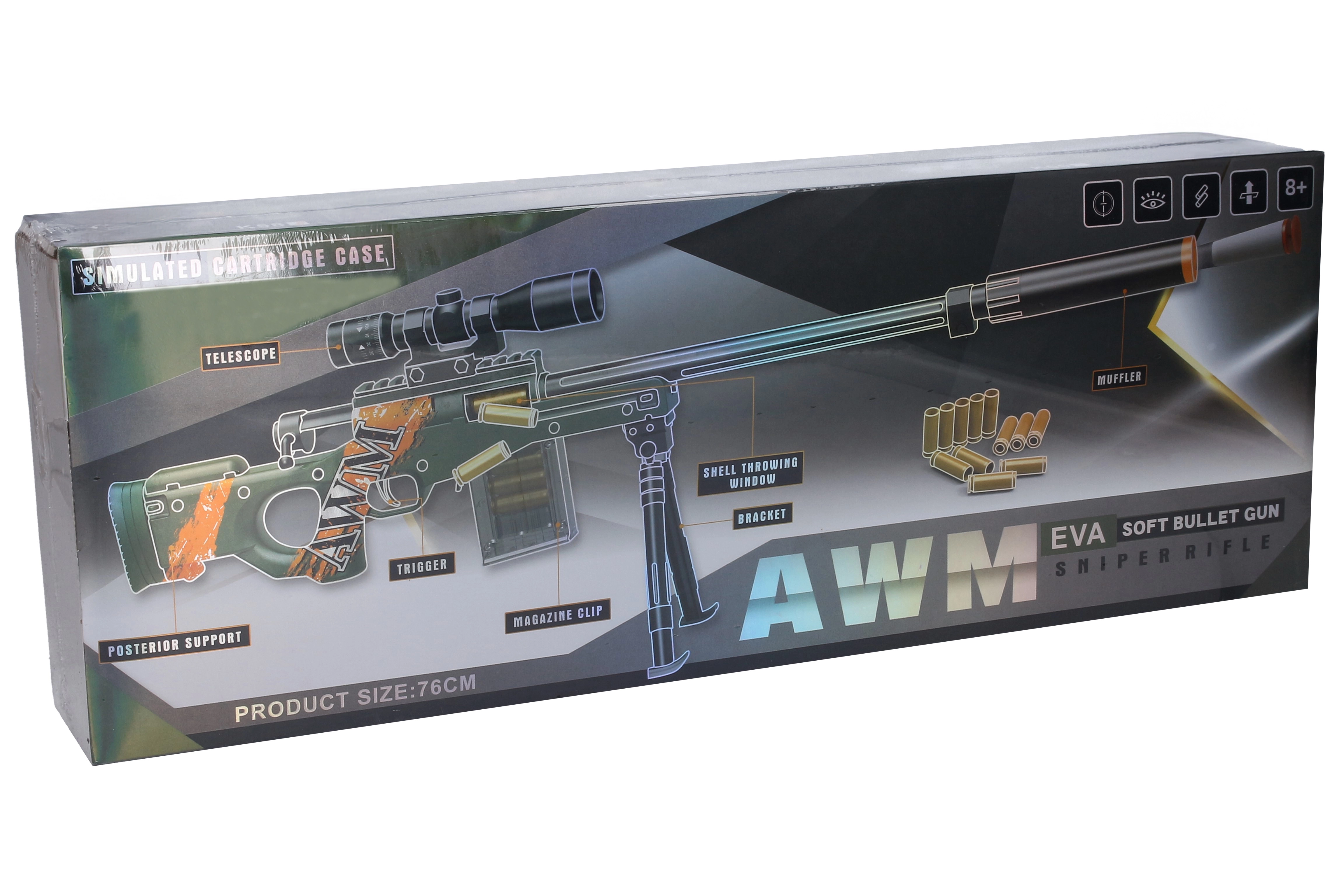 Un fusil pour enfants réaliste inspiré du modèle AWM qui ravira les jeunes amateurs de jeux d’action. Il offre une construction démontable, une longueur de 76 cm, un trépied, un silencieux et une hausse pour une meilleure visée. L’emballage comprend 10 cartouches et 10 fléchettes en mousse. Au dos de la boîte, vous trouverez un guide illustré pour l’assemblage et l’utilisation.