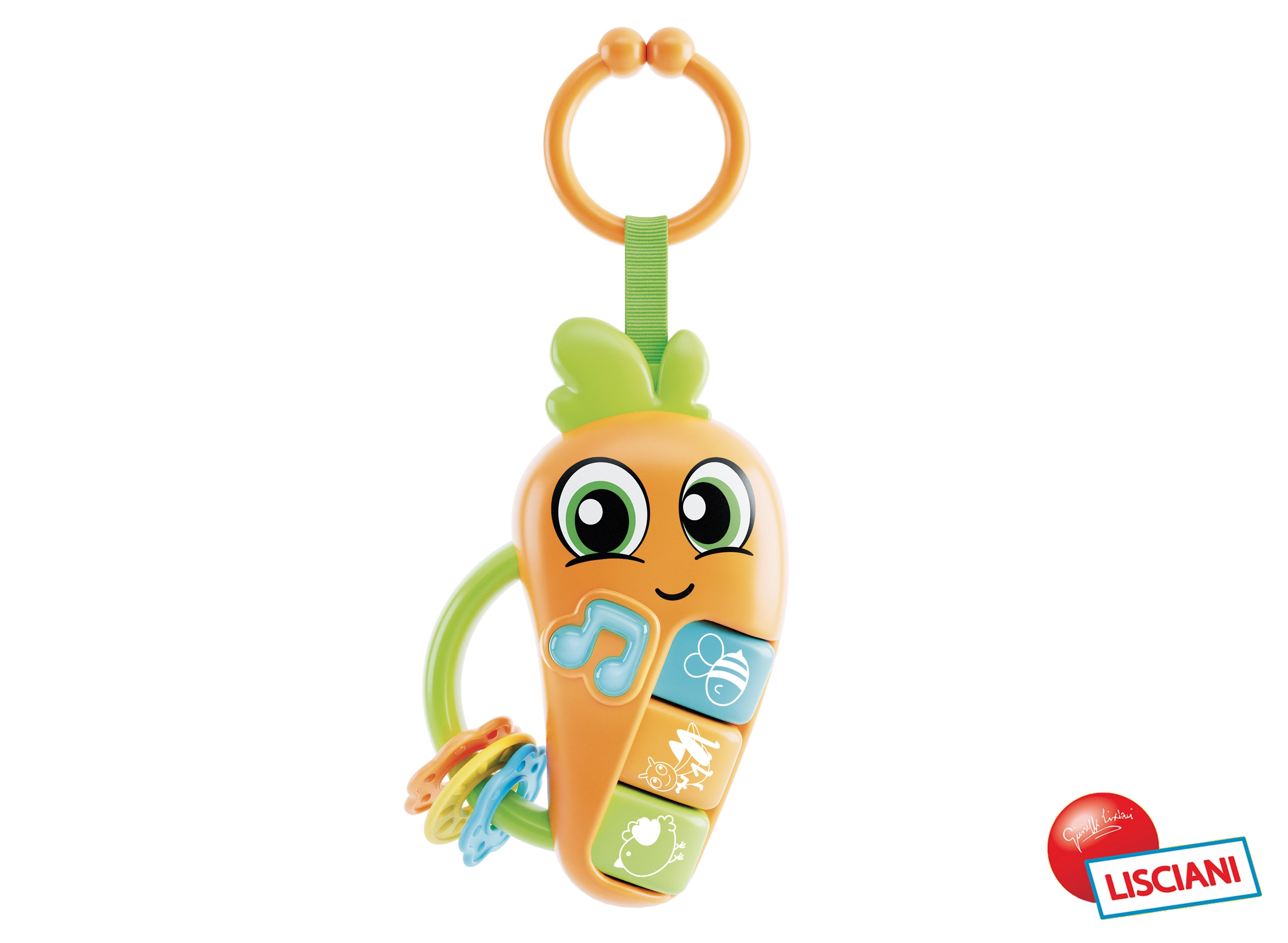 La carotte amusante CAROTINA de 16 cm ravira les tout-petits grâce à ses effets lumineux et sonores. Elle comprend 3 boutons avec des animaux proposant des mélodies alternées et des sons d’animaux, un bouton avec une note pour 2 mélodies différentes avec clignotement, et un anneau pratique pour l’accrocher. Les piles 3× AG13 sont incluses dans l’emballage.
