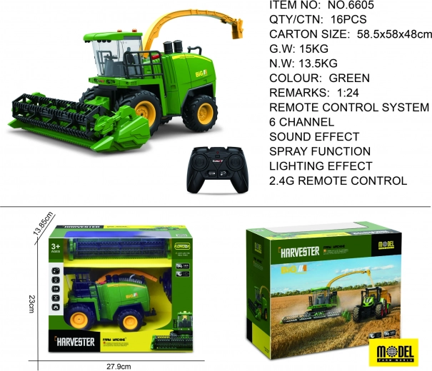 Cette moissonneuse-batteuse R/C verte offre aux enfants une expérience de récolte réaliste. Grâce à la conduite avant/arrière et latérale, au barre de coupe rotatif et au tuyau de déchargement orientable manuellement à 360°, elle se comporte comme une machine réelle. Les feux LED sur la cabine et à l’avant, ainsi que les sons du moteur et le signal de marche arrière, peuvent être facilement activés et désactivés depuis la télécommande.