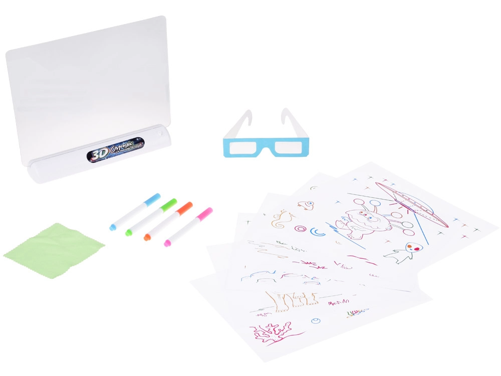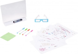 La plaque transparente avec éclairage LED illumine les traits des feutres. En enfilant les lunettes 3D, les dessins gagnent en profondeur réaliste et en effet waouh.