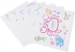 Des gabarits recto-verso sur le thème de la mer sont inclus. Les enfants peuvent les glisser derrière la plaque et décalquer facilement leurs premiers dessins.