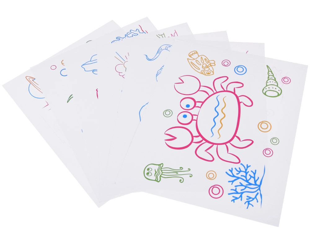 La tablette est facile à nettoyer — il suffit d’essuyer avec un chiffon et de recommencer. La boîte contient 4 feutres colorés et des modèles recto-verso sur le thème de la mer, qui aident à trouver l’inspiration et apprennent aux enfants à jouer avec les couleurs et les formes.