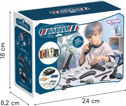 Le set contient tout le nécessaire pour des soins complets de coiffure et de barber : du sèche-cheveux et du lisseur aux tondeuses, ciseaux, peignes et terminal de paiement avec argent. Les enfants pourront servir les clients, payer par carte ou en espèces et apprendre les bases de la communication et de la collaboration.