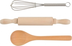Tablier, toque, manique et dessous de plat, plus un rouleau en bois, une cuillère et un fouet en métal – tout ce dont l’enfant a besoin pour jouer à cuisiner en toute sécurité et avec plaisir.