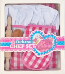 Le tablier réglable avec petite poche, la toque et la manique rembourrée avec dessous de plat sont complétés par de vrais ustensiles : un rouleau à pâtisserie en bois, une cuillère en bois et un fouet en métal. L’ensemble est léger, confortable et facile d’entretien grâce au tissu de qualité.