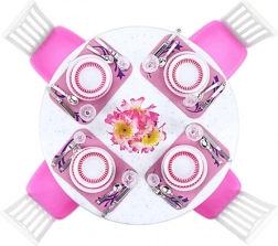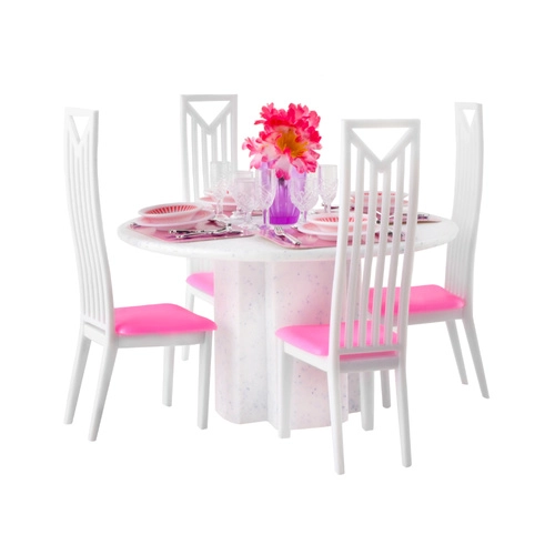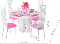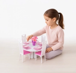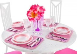 Table ronde, quatre chaises et service complet d’assiettes et de couverts. Le tout assorti en rose‑blanc pour des repas réalistes et une belle présentation.