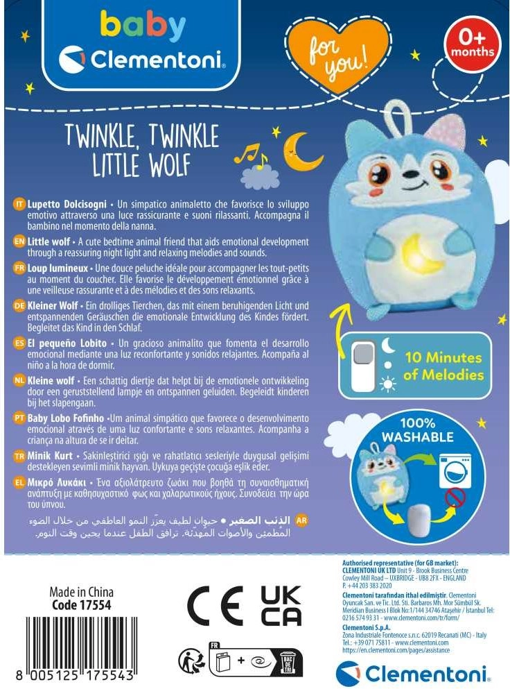 Le loup en peluche interactif Twinkle Twinkle est un formidable compagnon pour un sommeil paisible et une stimulation ludique. Sa lumière douce et ses mélodies délicates encouragent la perception auditive et visuelle, tandis que sa surface moelleuse développe le toucher et procure un sentiment de sécurité. Grâce à sa fabrication de qualité et à ses matériaux certifiés, ce jouet convient aux tout-petits dès les premiers jours.