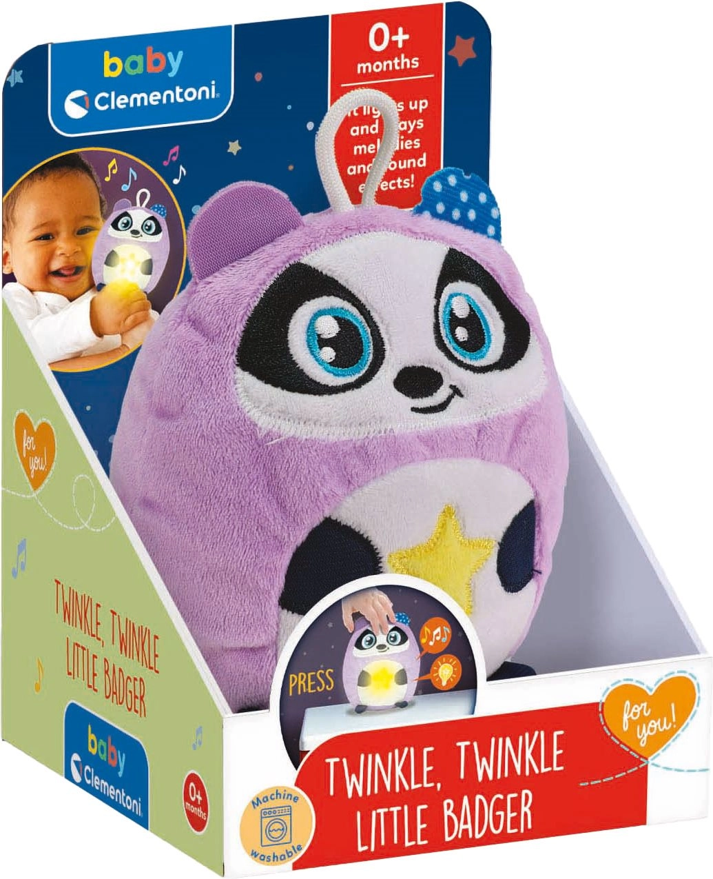 Adorable peluche interactive Clementoni Baby Twinkle Twinkle petit blaireau conçue pour les tout-petits. Elle offre de doux effets lumineux et sonores pour apaiser et divertir, une texture moelleuse et douce pour les câlins, ainsi qu’une stimulation des sens et de la motricité fine. Convient dès la naissance, idéale pour le lit comme pour les déplacements. Fabriquée avec des matériaux sûrs et certifiés, et facile à entretenir.