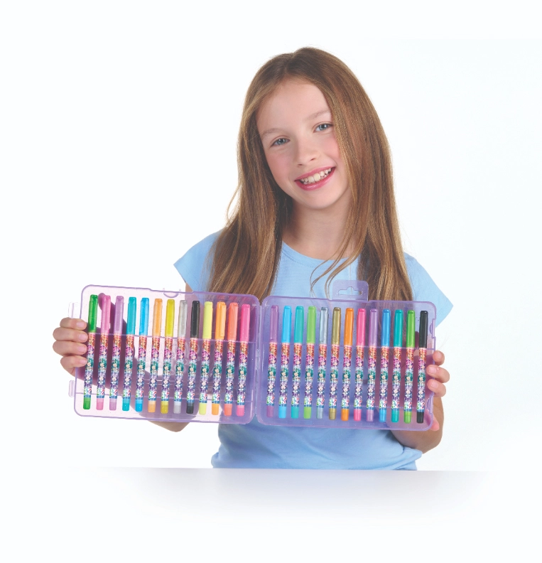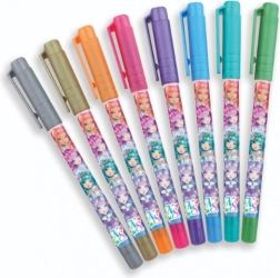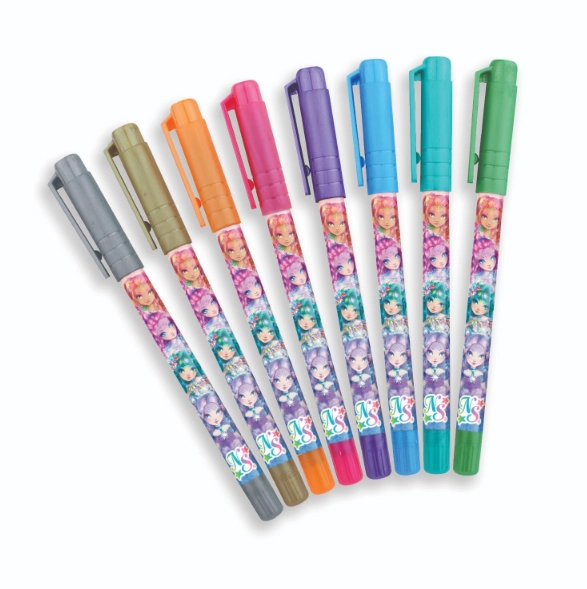 - 9 stylos gel pailletés, 8 stylos métalliques, 8 stylos néon, 1 stylo gel noir