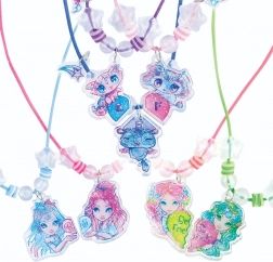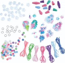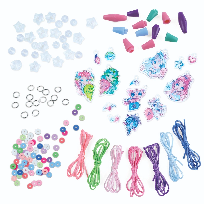 - 7 grands pendentifs acryliques scintillants, 7 petits pendentifs acryliques, 98 perles variées, 14 anneaux de jonction, 7 cordons soyeux colorés, une planche de strass autocollants, guide illustré coloré