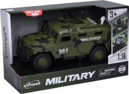 Voiture militaire réaliste à inertie offrant des effets lumineux et sonores, des portes avant ouvrantes et une construction robuste d’une longueur de 25,5 cm. Commande facile via les boutons sur le toit, piles incluses dans l’emballage.