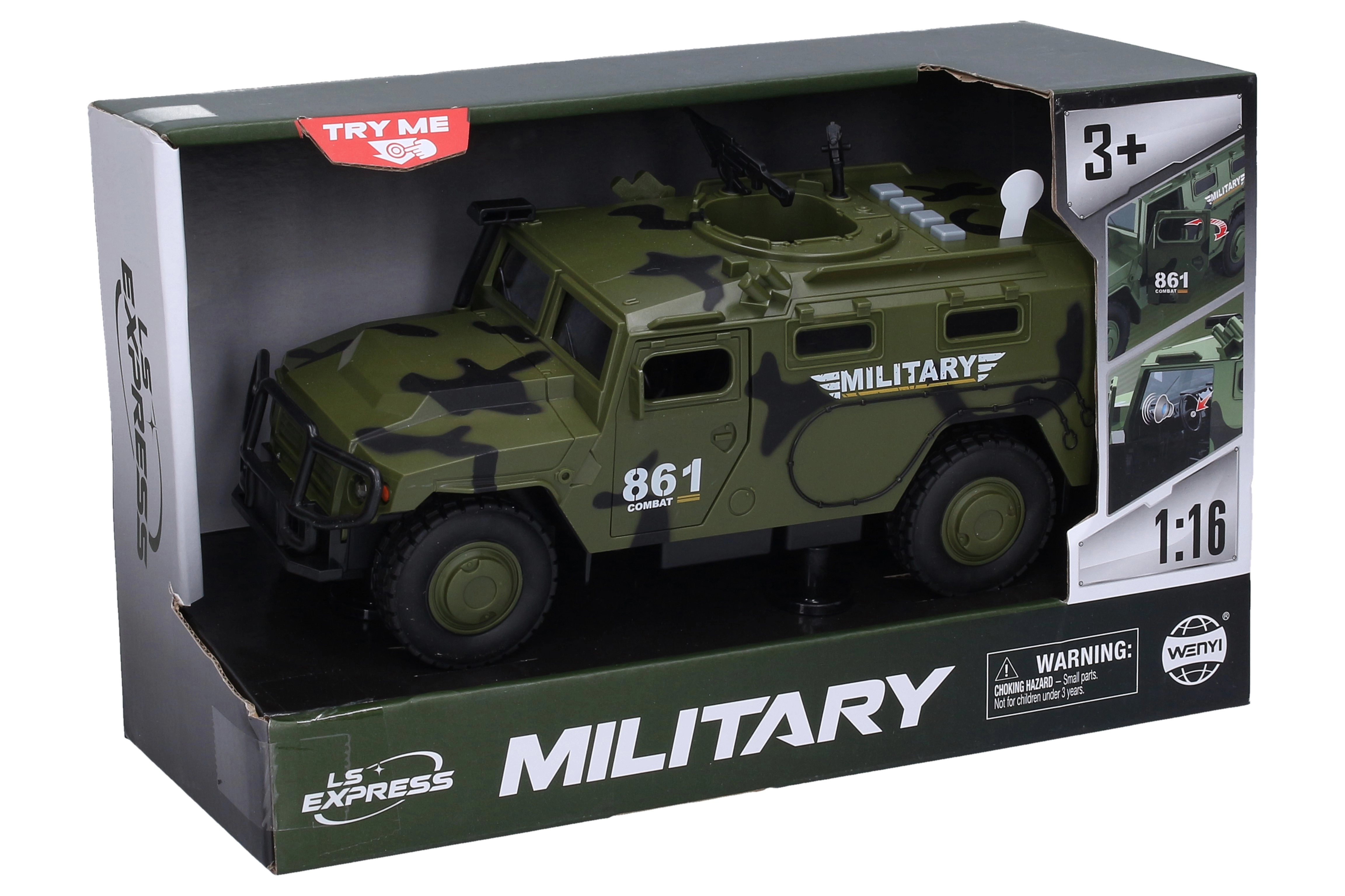 Faites plaisir aux petits passionnés de matériel militaire avec cette voiture militaire finement détaillée. Grâce à l’inertie, il suffit de la pousser pour qu’elle avance toute seule. Les boutons sur le toit activent des lumières et sons spectaculaires qui enrichissent le jeu et stimulent l’imagination.