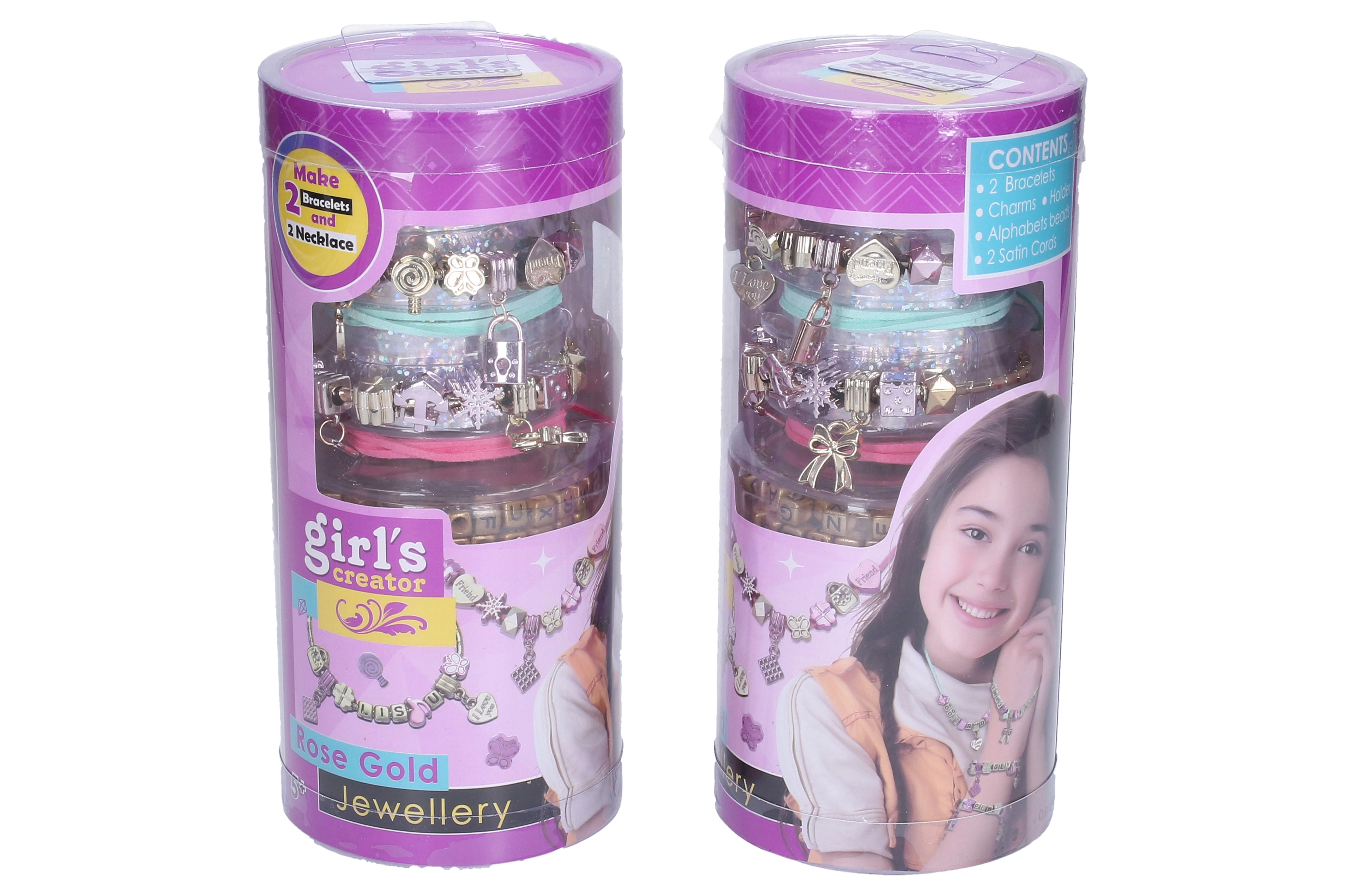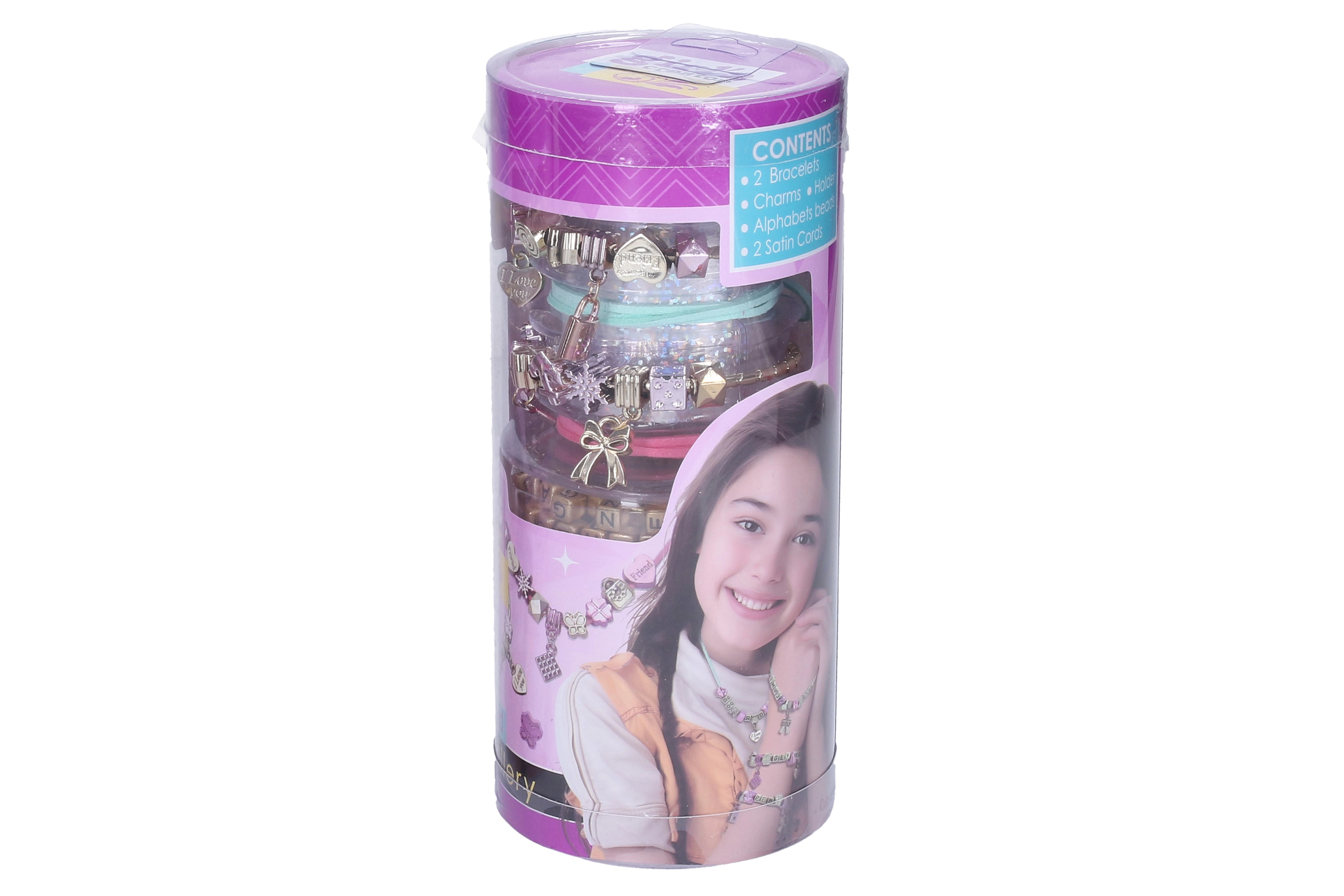 Ce kit créatif ravira toutes les petites designeuses de bijoux. L’emballage contient tout le nécessaire pour réaliser des bracelets et colliers stylés dans une élégante teinte rose gold – des breloques en forme de cœurs, étoiles et nœuds jusqu’aux perles lettres pour composer des prénoms et des messages.