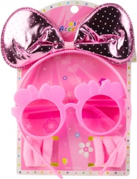Un élégant set rose d’accessoires pour petites coquettes comprenant des lunettes pour enfants au design ludique, un serre-tête avec grand nœud et 6 élastiques pour cheveux. Structure légère et sûre, idéale pour un usage quotidien, les jeux de styliste et les déguisements de princesse.