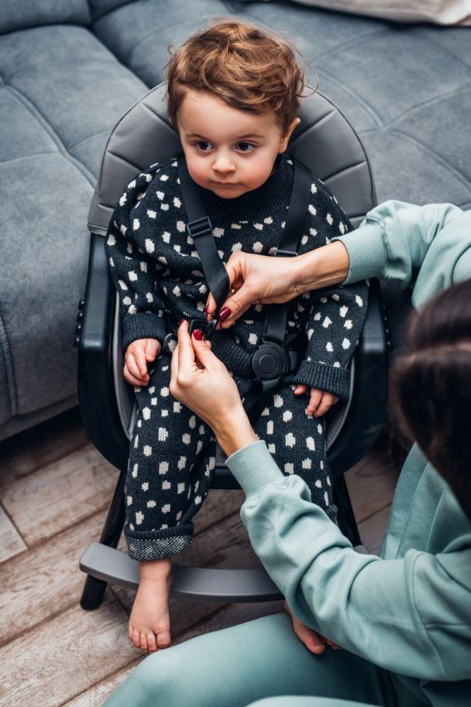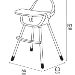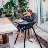 Le plateau double bien pensé avec porte-gobelet est réglable et sa partie supérieure peut être mise au lave‑vaisselle. La structure stable avec repose‑pieds et harnais de sécurité garantit confort et protection. Son design minimaliste aux couleurs sobres s’intègre aisément dans une cuisine ou une salle à manger moderne.