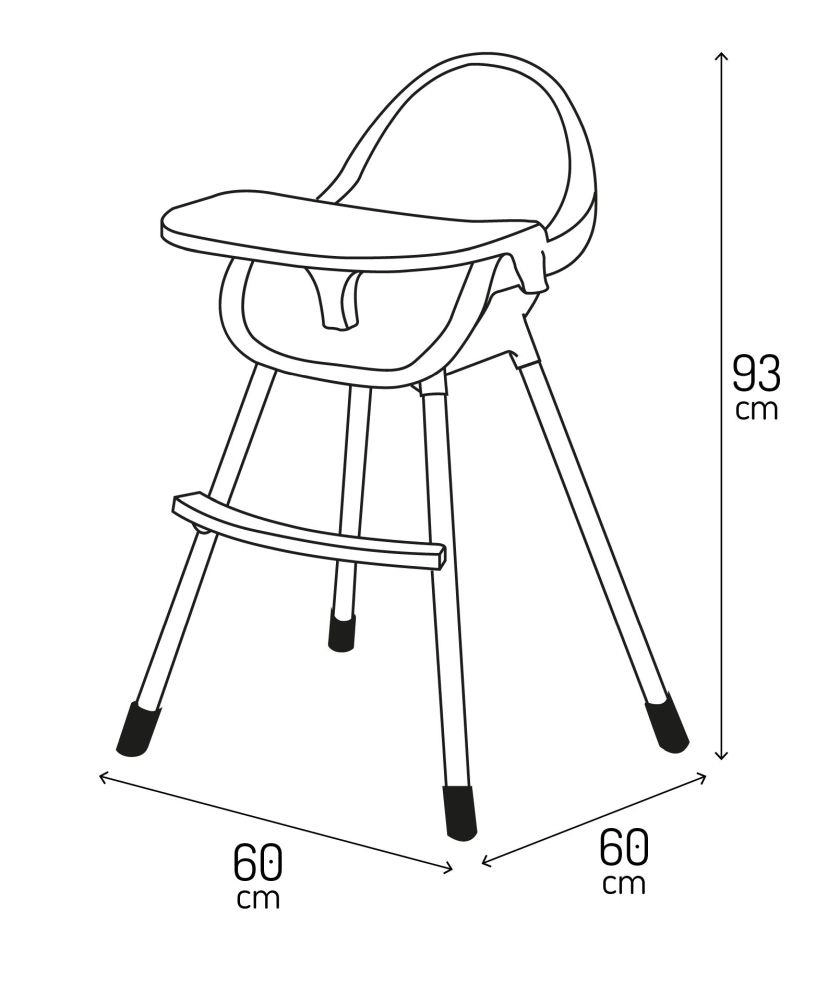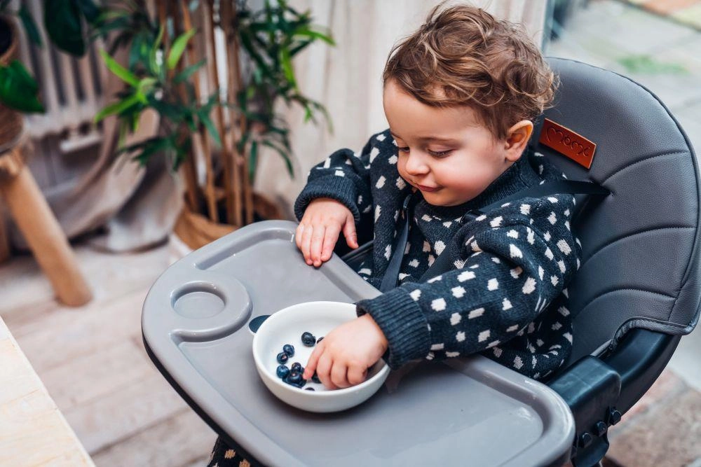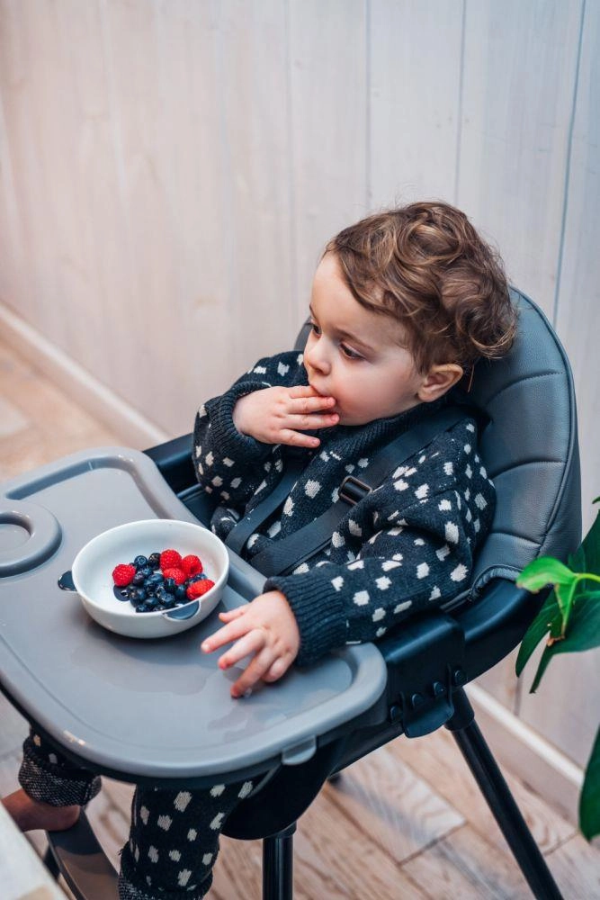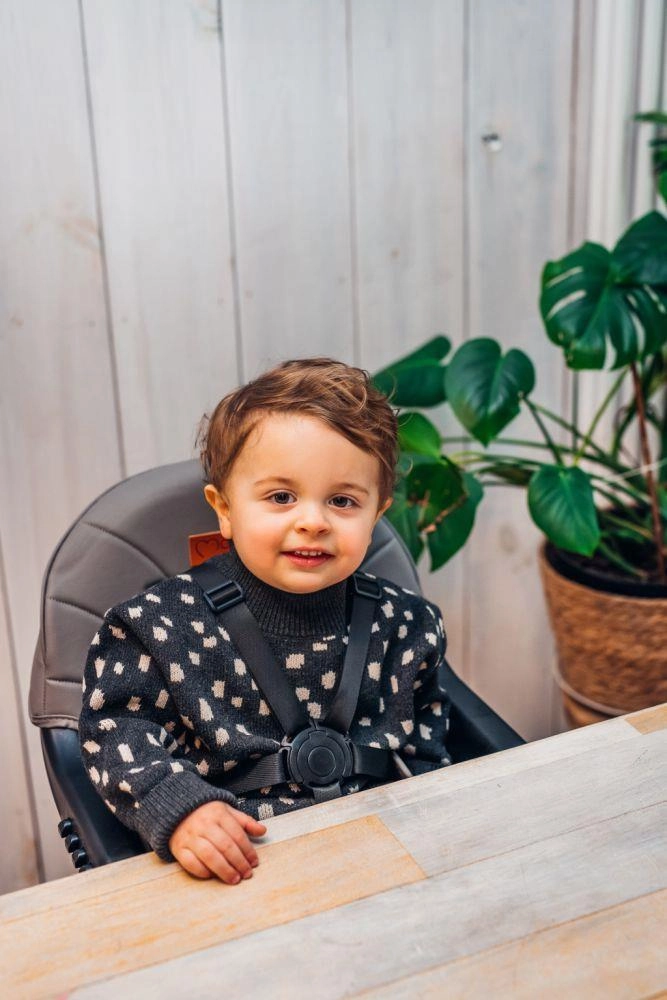 Des détails pratiques facilitent l’usage quotidien : l’éco-cuir s’essuie rapidement, la partie supérieure du plateau passe au lave-vaisselle et le plateau réglable s’adapte à votre enfant. La structure stable avec repose-pieds et harnais de sécurité garantit une assise confortable et sûre.