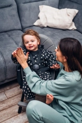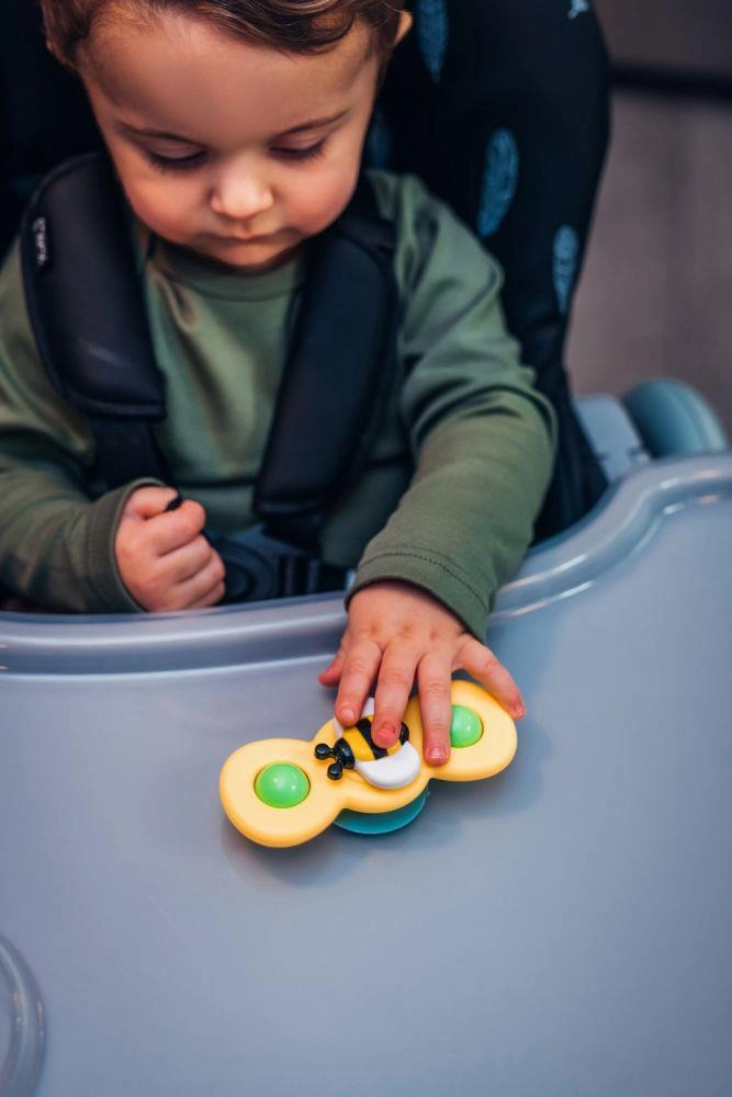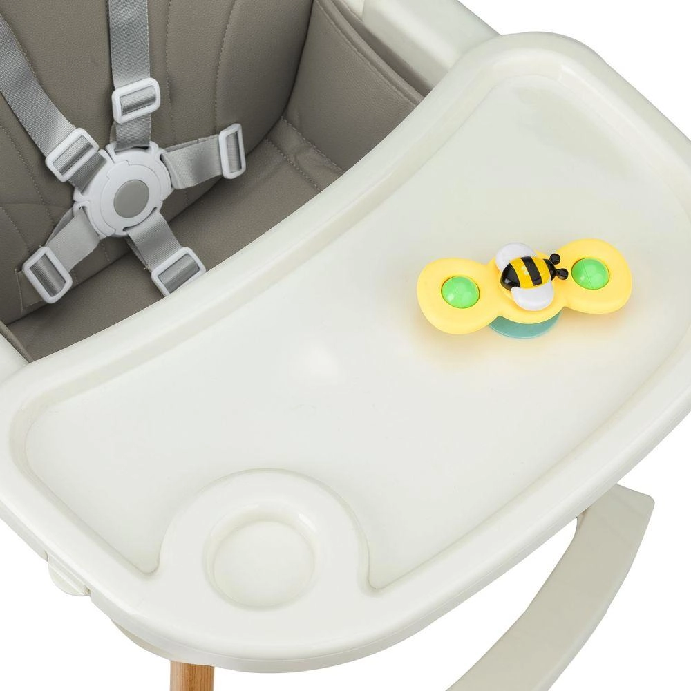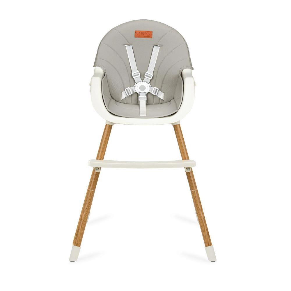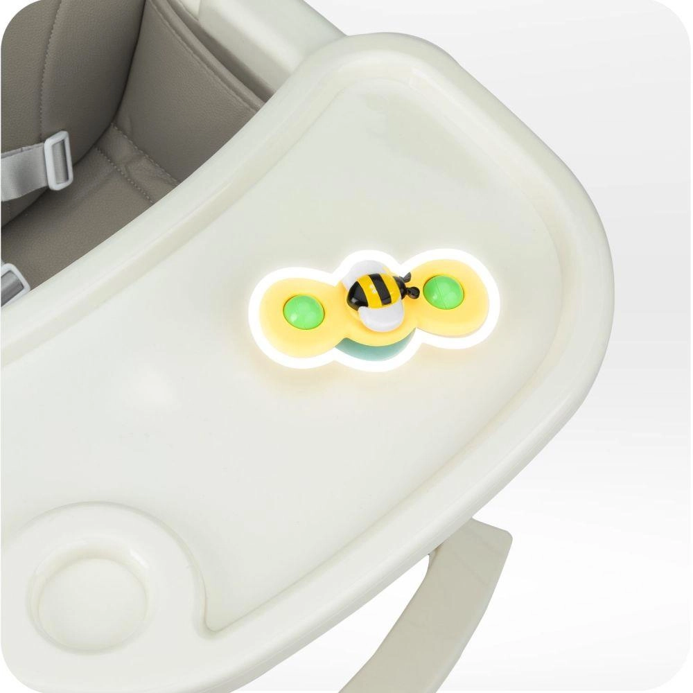 Des détails pratiques facilitent l’usage quotidien : l’éco-cuir s’essuie rapidement, la partie supérieure du plateau passe au lave-vaisselle et le plateau réglable s’adapte à votre enfant. La structure stable avec repose-pieds et harnais de sécurité garantit une assise confortable et sûre.