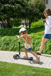 MoMi SAN est la trottinette idéale pour les jeunes débutants. Les trois roues garantissent une excellente stabilité, tandis que la plateforme basse et large permet un montée et descente en toute sécurité. Les roues LED lumineuses plaisent aux enfants et améliorent la visibilité pendant la conduite.