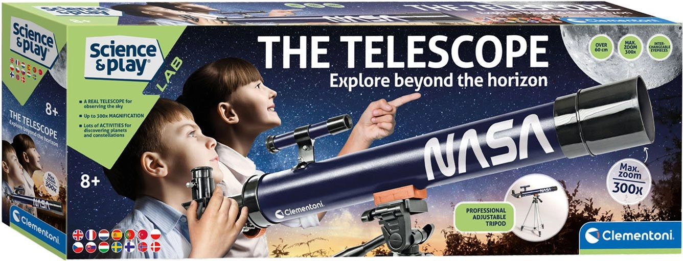 Explorez le ciel nocturne avec le télescope pour enfants CLEMENTONI de la série Science & Play. Ce télescope astronomique de qualité, inspiré par la NASA, offre un agrandissement de 50× à 100×, complété par une lentille de Barlow pour un grossissement triplé. Grâce à son objectif de 50 mm et à son trépied robuste jusqu’à 130 cm, il est idéal pour des premières observations de la Lune, des étoiles et des planètes. Un manuel illustré explique aux enfants les bases de l’astronomie. Convient à partir de 8 ans, excellente jouet STEM pour apprendre en s’amusant.