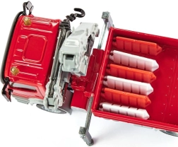 La grue, fidèlement reproduite, pivote et grâce à ses articulations atteint facilement la charge, que vous soulevez en toute sécurité avec le crochet.