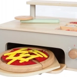 Les enfants peuvent “régler la température” et écouter le clic amusant en tournant le bouton. Le four sert aussi de garde‑manger et de comptoir de vente – idéal pour un jeu de pizzeria complet.