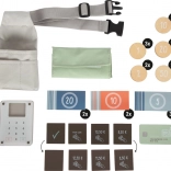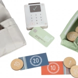 Une pochette de ceinture avec porte‑monnaie, billets de jeu et lecteur de cartes permet aux enfants d’accepter des “paiements”, d’émettre des reçus et d’entraîner leurs compétences sociales.