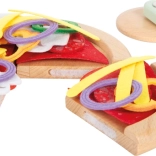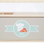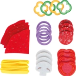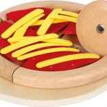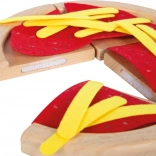 Les parts de pizza en bois se fixent grâce au scratch et se séparent facilement avec la roue à pizza. Les garnitures en feutre stimulent l’imagination et d’infinies combinaisons de saveurs.