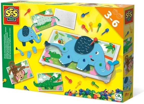 Contenu de la boîte : plaque de mosaïque perforée, 100 chevilles en plastique en quatre couleurs, fond en carton au motif jungle et pièces en carton pour les corps, têtes et pattes des animaux.