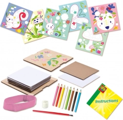- Kit complet : presse, 6 cartes à décorer, 8 crayons, colle et pinceau