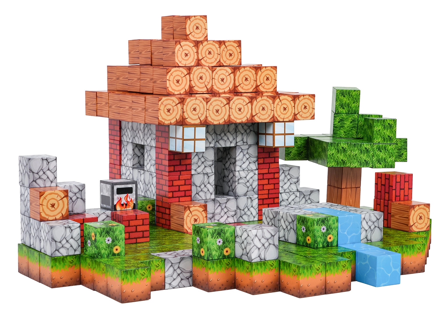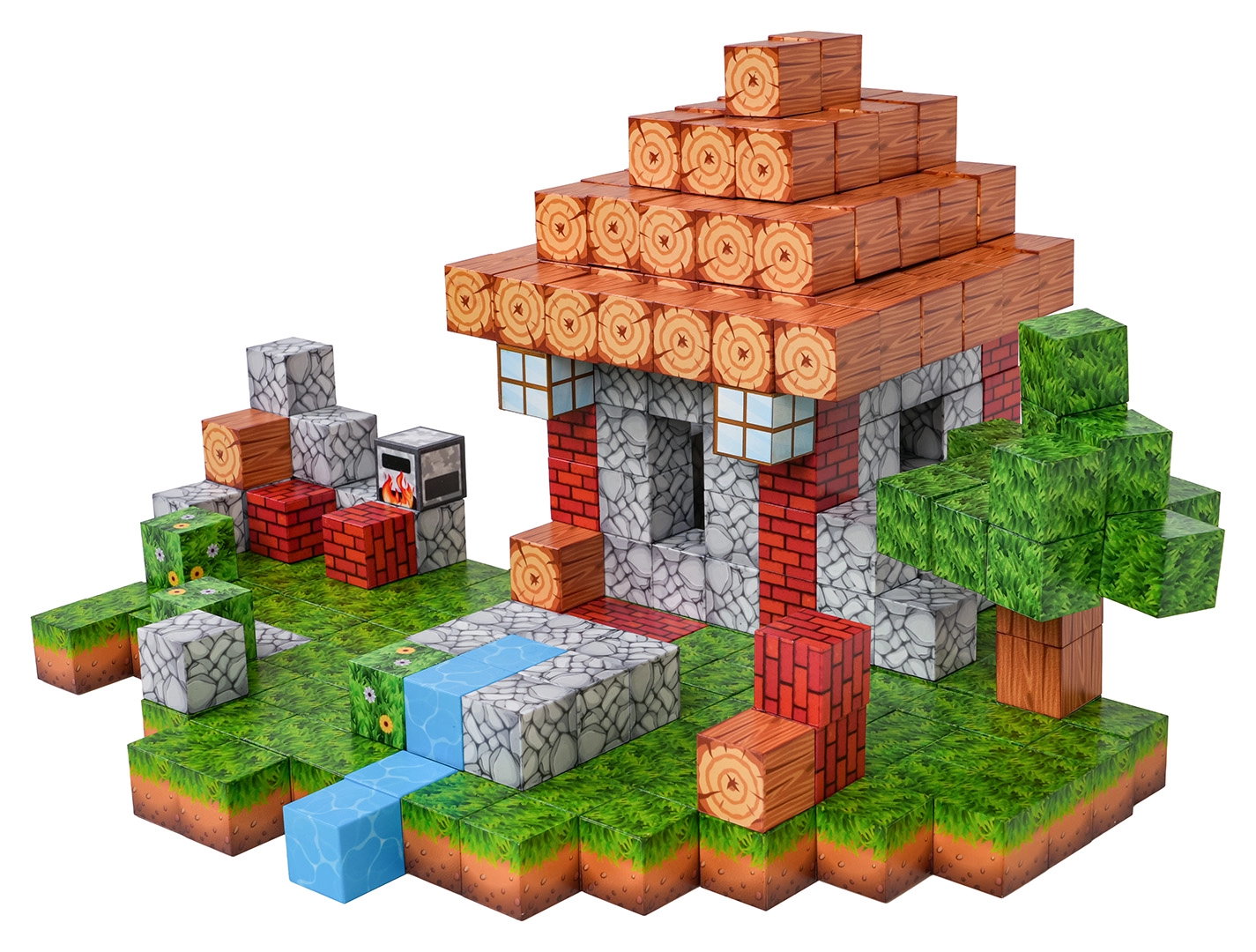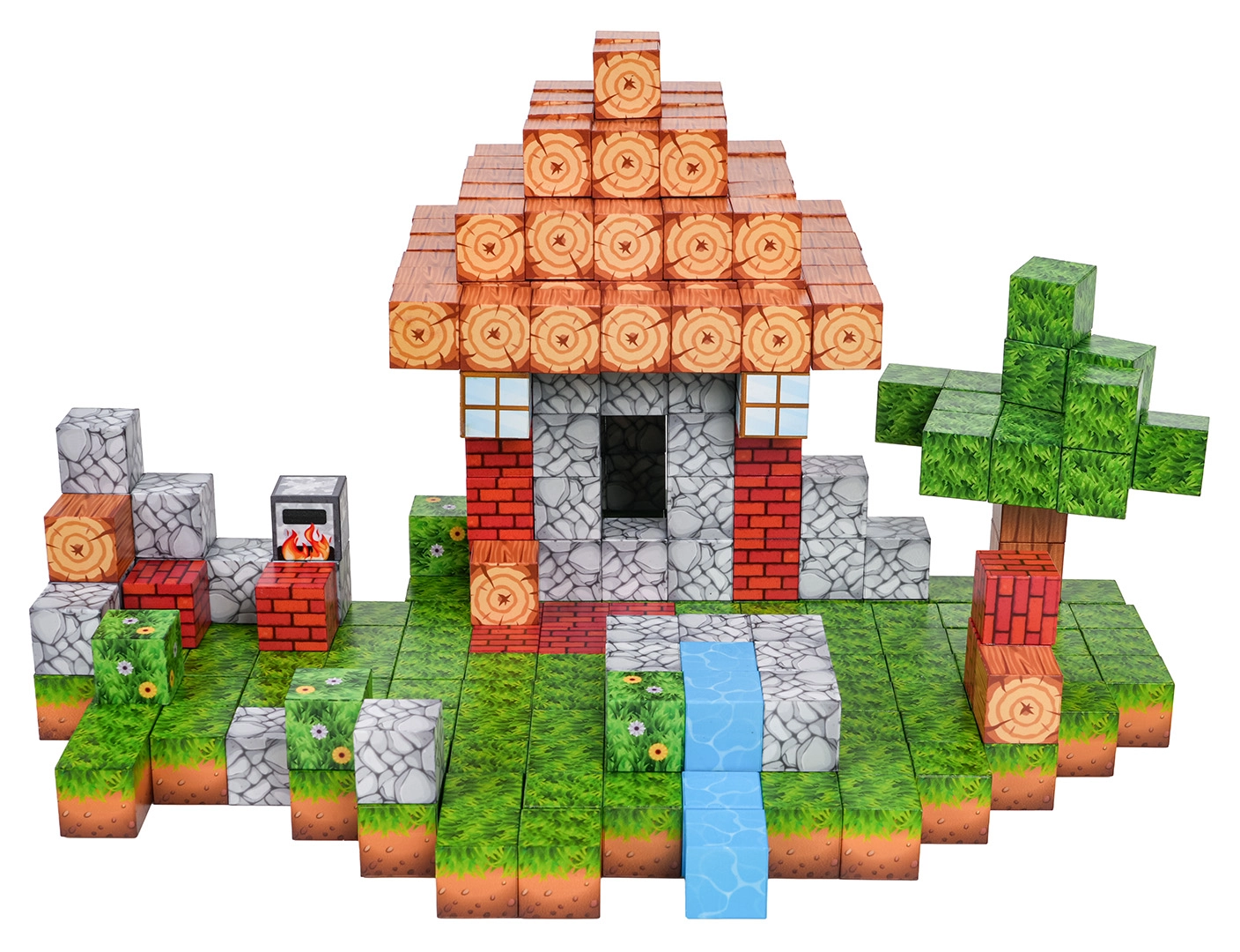 Le grand nombre de blocs aux motifs variés permet d’assembler des scènes diverses – de la petite maison avec jardin au ruisseau et au paysage pixélisé.