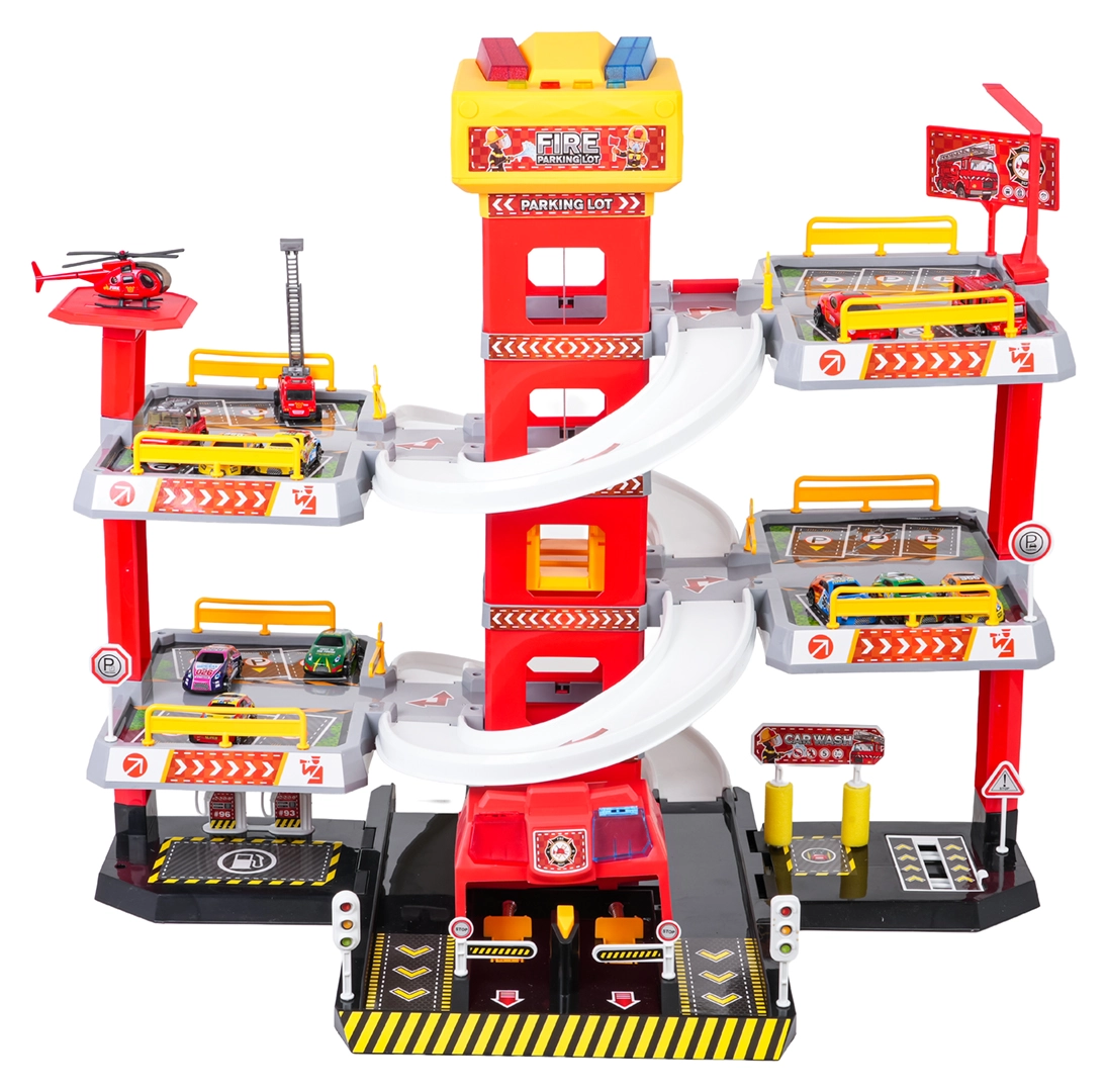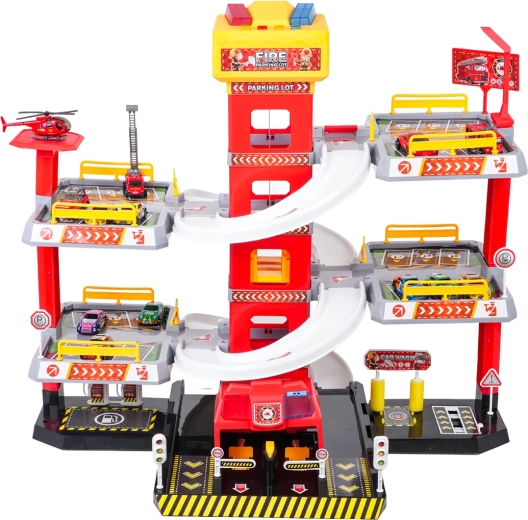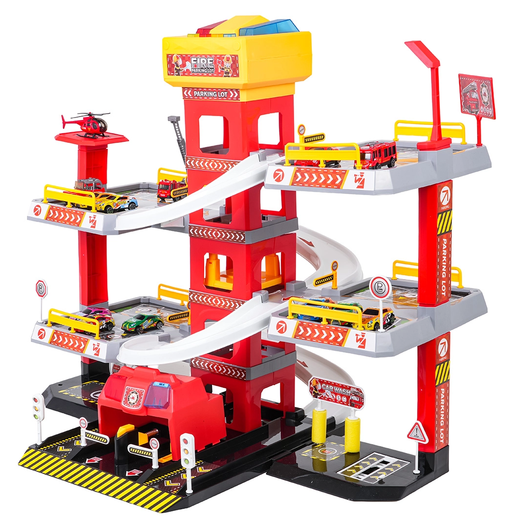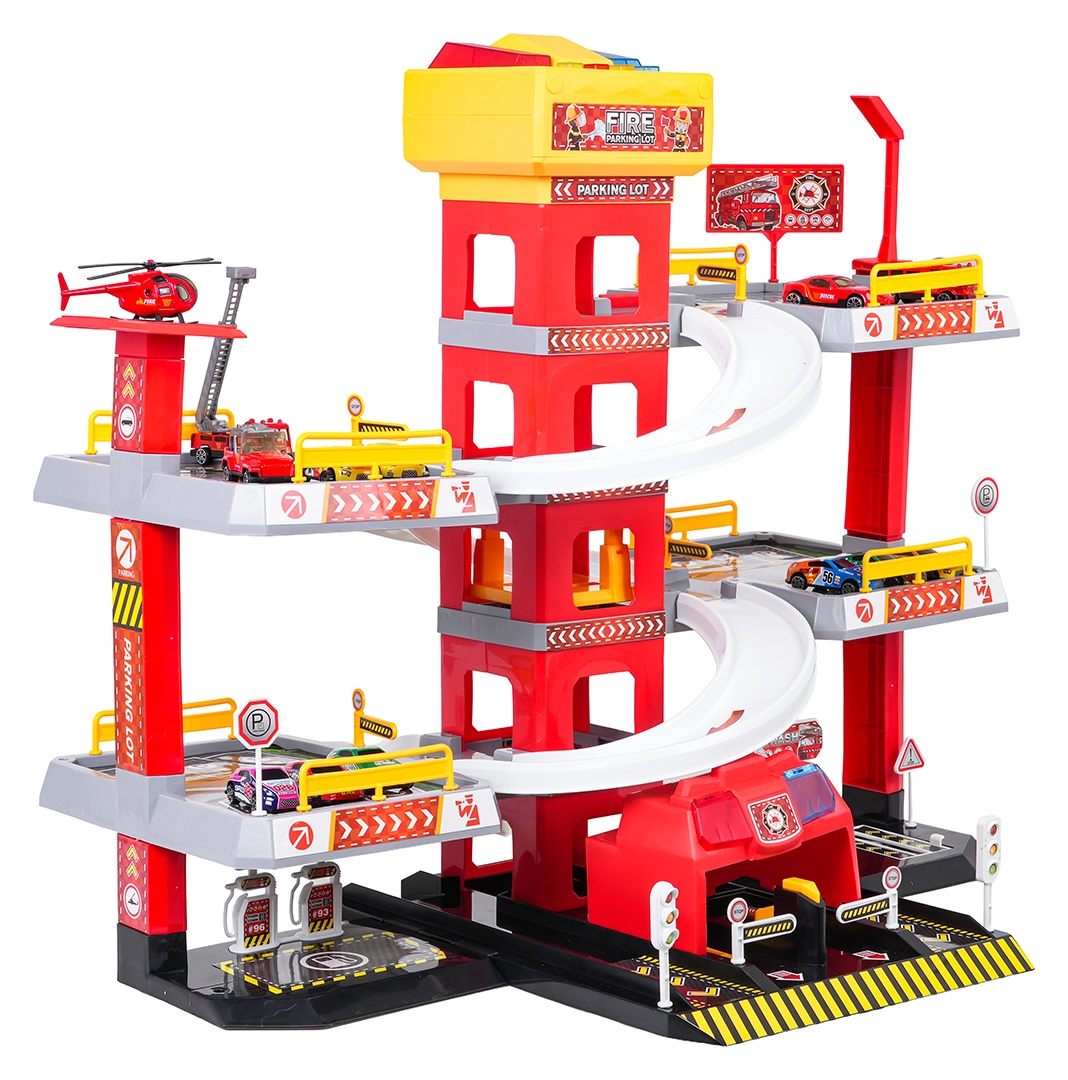 Ce grand parking de pompiers à 3 niveaux offre aux enfants un jeu réaliste et dynamique. Grâce à la tour centrale avec ascenseur, les petites voitures se déplacent facilement entre les étages ou filent vers le bas sur les rampes incurvées. Le panneau supérieur de l’ascenseur est équipé de grands boutons pour commander la montée/descente et de quatre petits boutons pour les effets – sons de démarrage, marche arrière, accélération, freinage et mélodie, complétés par des lumières clignotantes.