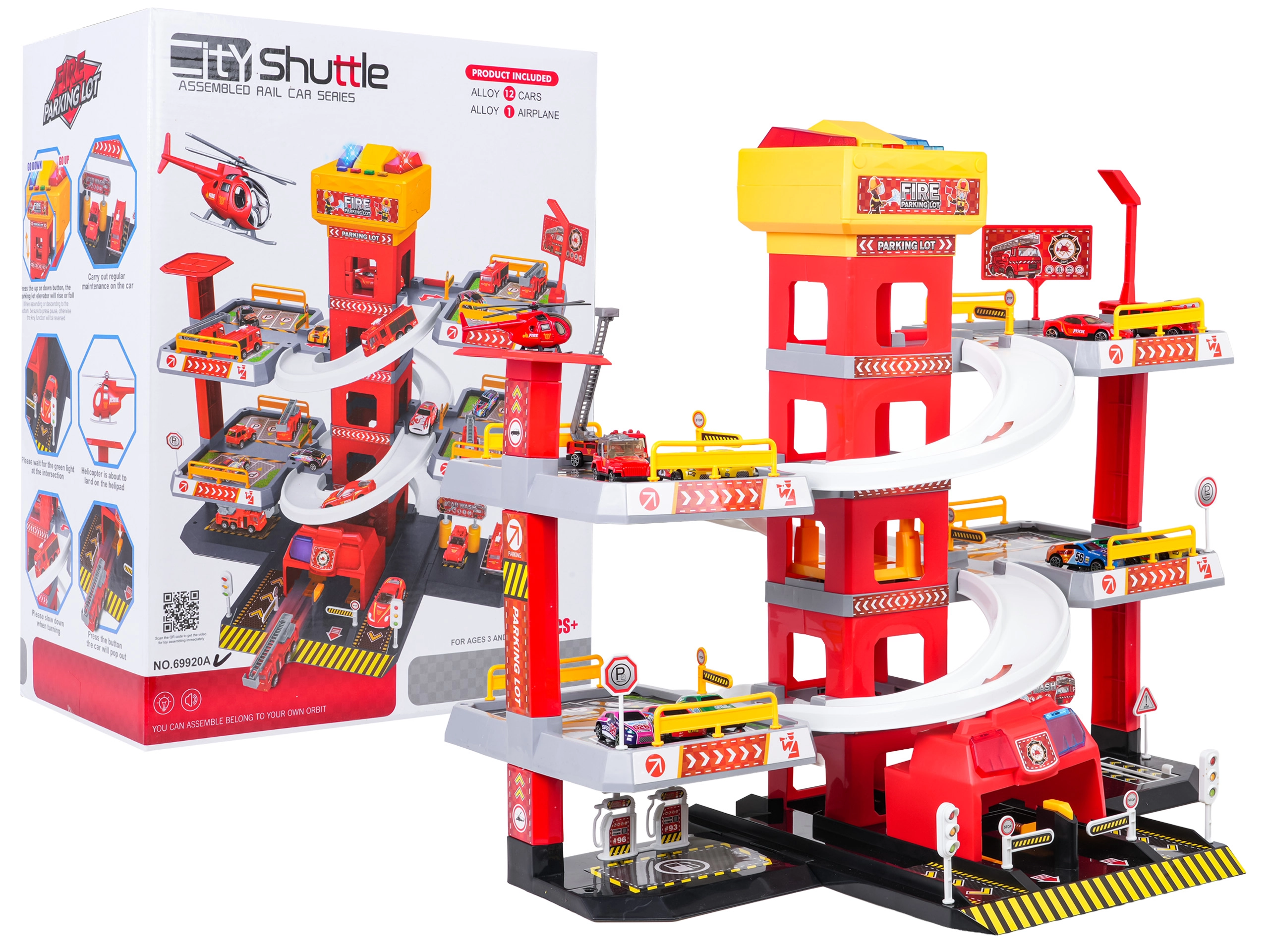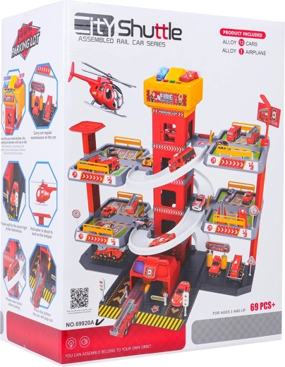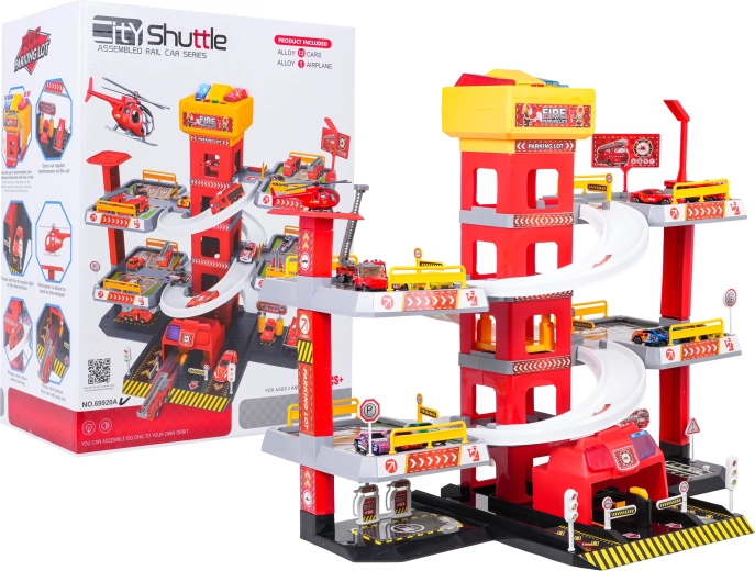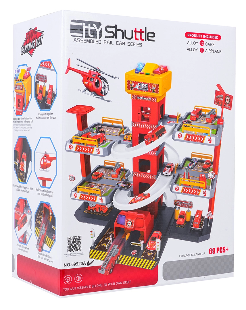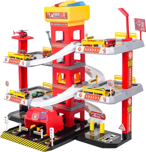 Ce grand parking de pompiers à 3 niveaux offre aux enfants un jeu réaliste et dynamique. Grâce à la tour centrale avec ascenseur, les petites voitures se déplacent facilement entre les étages ou filent vers le bas sur les rampes incurvées. Le panneau supérieur de l’ascenseur est équipé de grands boutons pour commander la montée/descente et de quatre petits boutons pour les effets – sons de démarrage, marche arrière, accélération, freinage et mélodie, complétés par des lumières clignotantes.