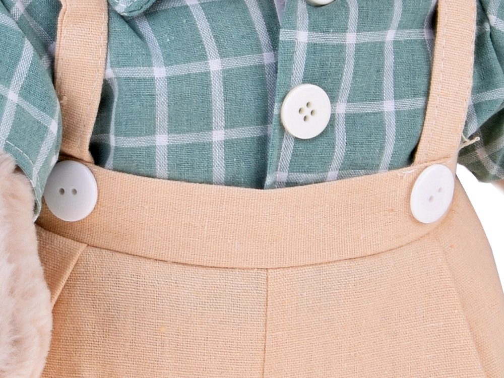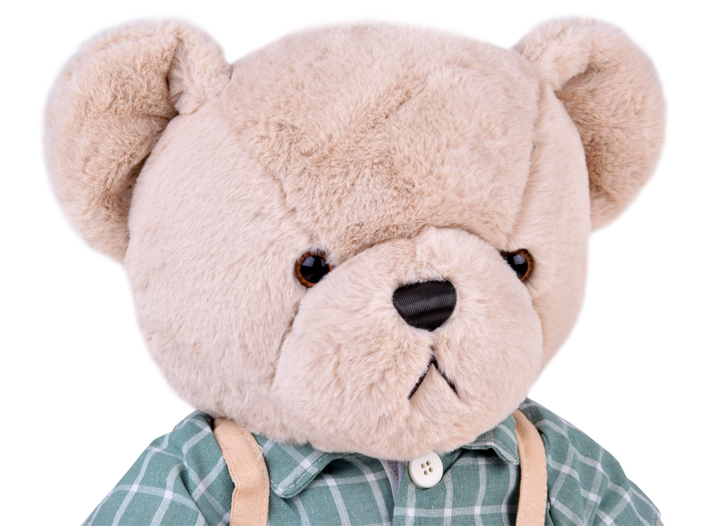 L’ours Franek allie douceur et design intemporel. Son pelage moelleux invite littéralement au câlin, et ses traits brodés discrets lui donnent une expression gentille et universelle. La chemise verte à carreaux blancs et le short clair à bretelles apportent une ambiance chaleureuse à toute chambre.
