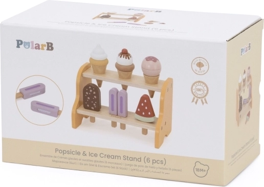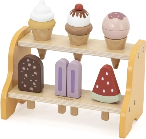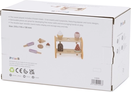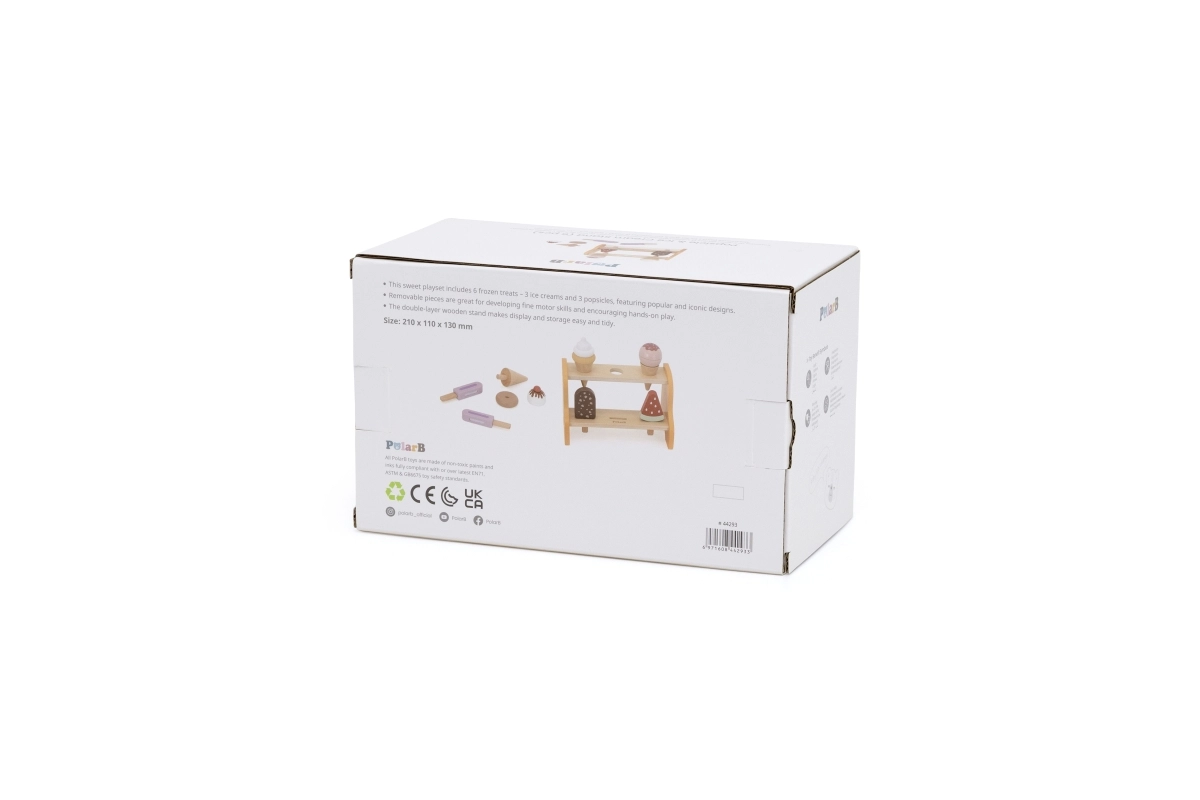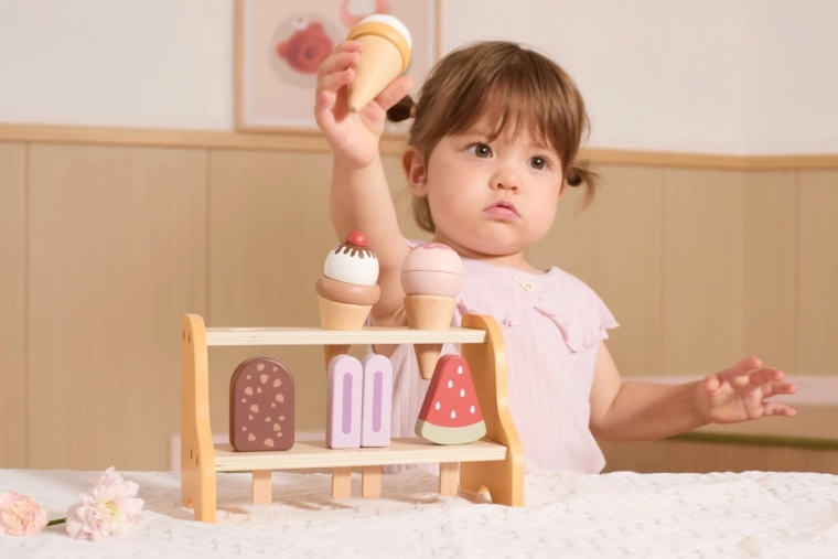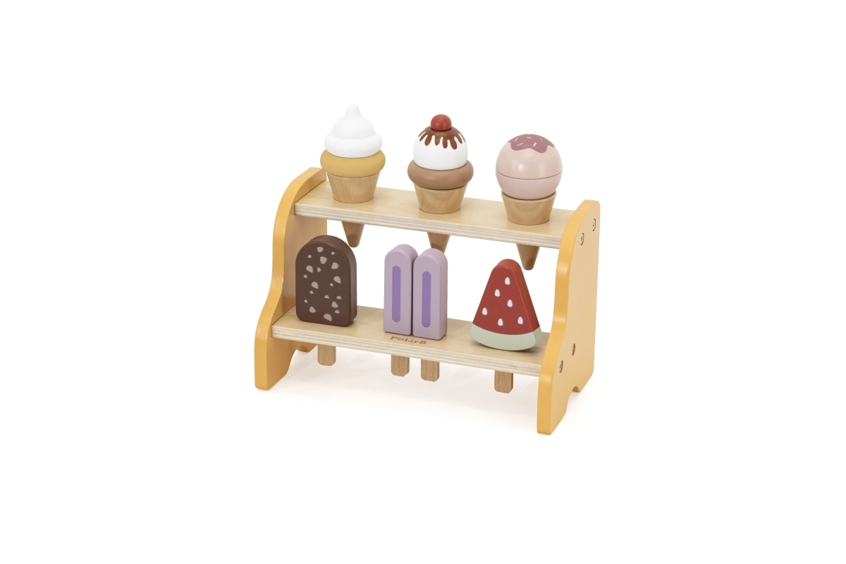Le présentoir pratique à deux étages garde tous les cornets et esquimaux à leur place. Les enfants apprennent naturellement à trier, ranger et présenter les « produits » comme dans une véritable glacière.