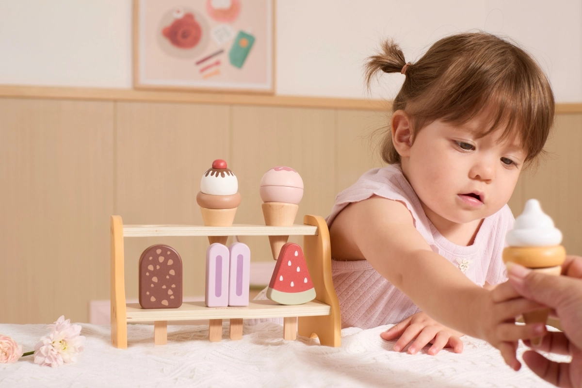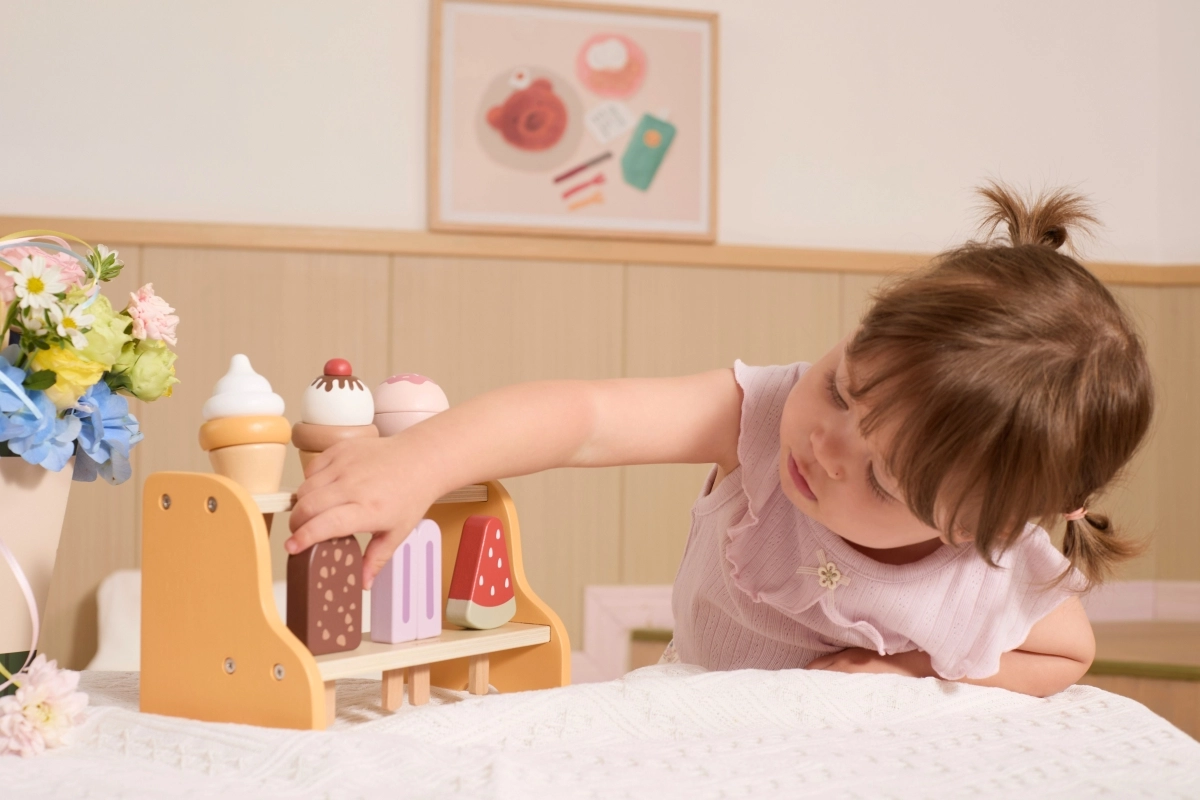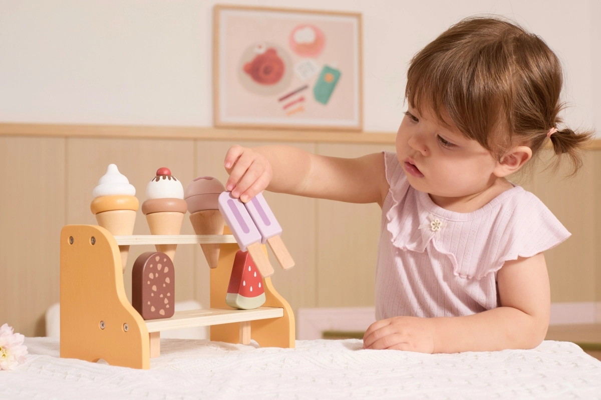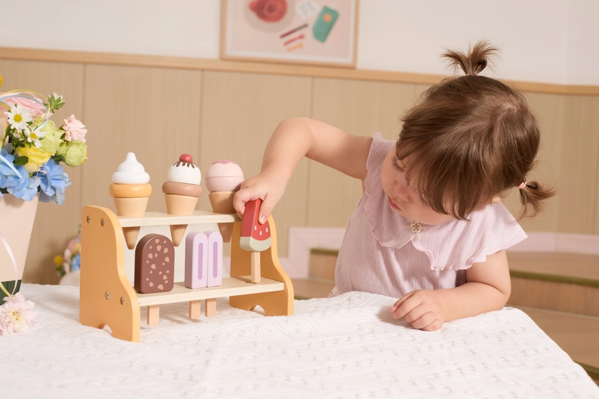 Le jeu de glacier développe la motricité fine, la coordination œil–main et les compétences sociales lors de la vente et de l’achat en commun. Grâce aux éléments amovibles, les enfants exercent la prise en main, le tri et le sens de l’ordre, tandis que les formes et couleurs réalistes stimulent l’imagination et la créativité.