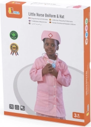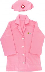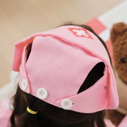 Le set comprend une coiffe rose assortie avec une croix bien visible, qui souligne le rôle de la petite infirmière.