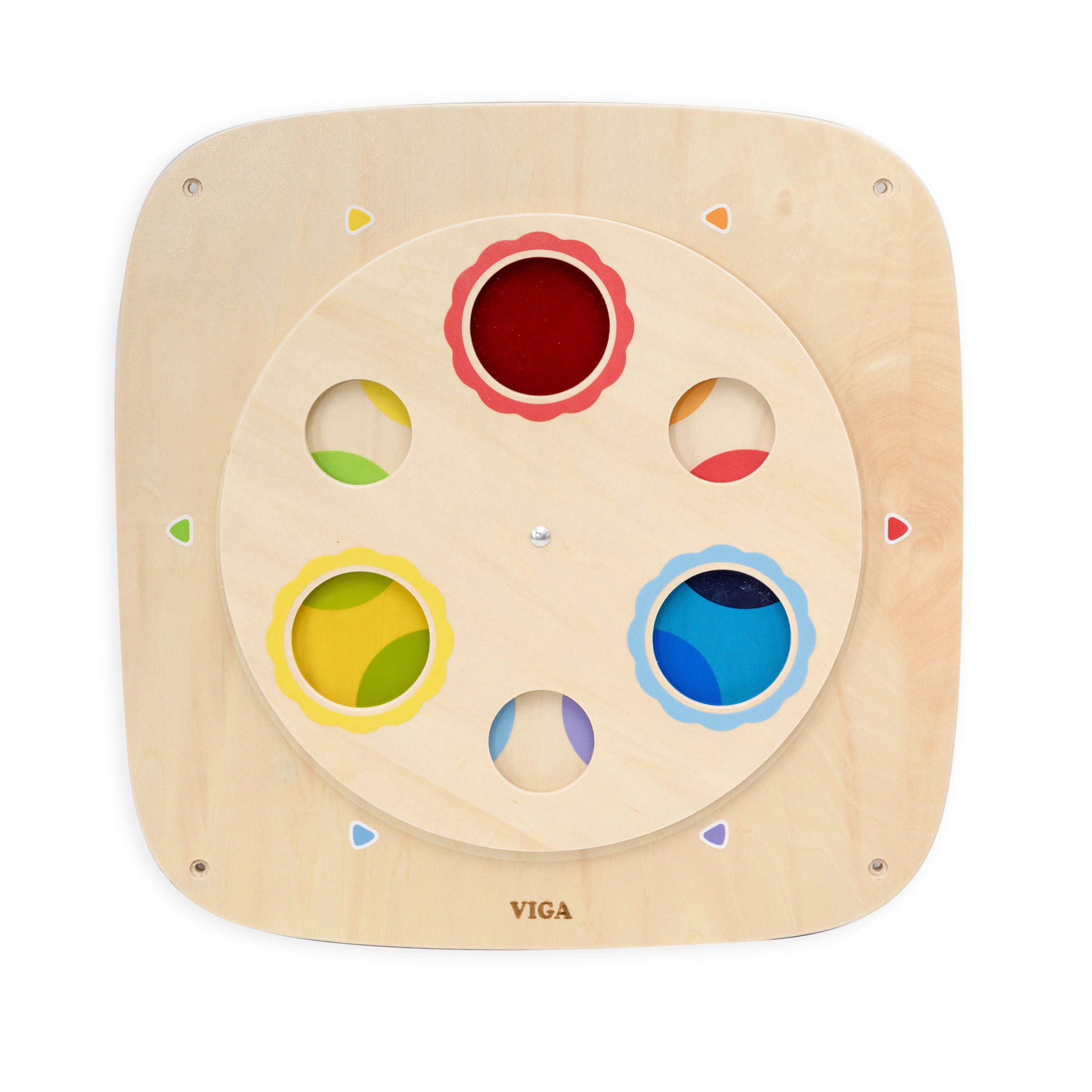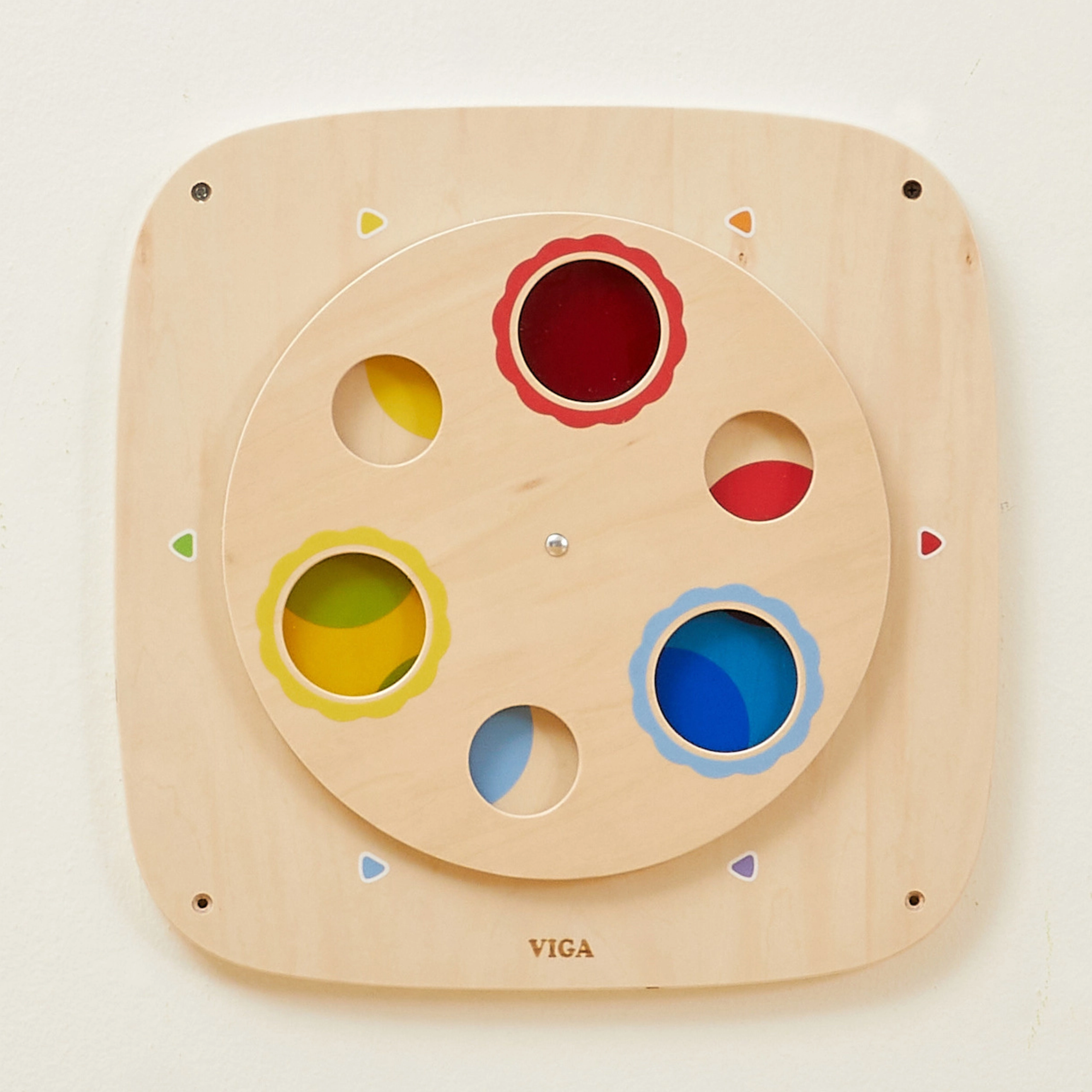 Ce tableau mural sensoriel en bois VIGA de haute qualité propose l’apprentissage de la théorie des couleurs de façon ludique. Le panneau circulaire rotatif avec fenêtres colorées transparentes permet aux enfants de comparer les couleurs, de les superposer et de découvrir de nouvelles teintes. Grâce à sa conception robuste, le tableau est idéal pour la maison, les maternelles et les espaces de jeu.