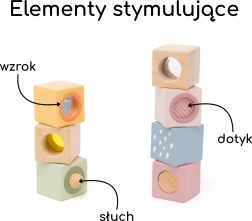 Chaque bloc possède un élément unique pour une stimulation multisensorielle – du miroir au hochet, jusqu’aux structures tactiles. Grâce à leurs dimensions adaptées, ils se saisissent facilement, développent la coordination œil–main, la motricité fine et encouragent le jeu libre créatif.