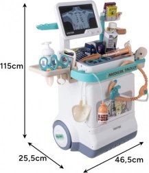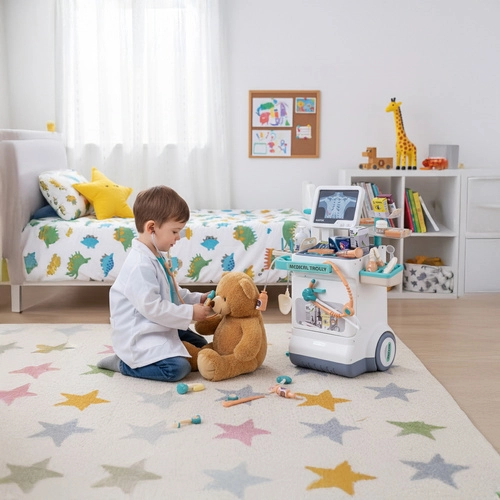 La station médicale pour enfants mobile offre un jeu de rôle médical réaliste à la maison. Le chariot à deux niveaux avec roulettes, écran ECG/Radiographie et riche équipement permet aux enfants de s’occuper des patients – peluches comme membres de la famille. Les effets lumineux et sonores (battements, signal ECG) stimulent la curiosité et illustrent le fonctionnement d’un cabinet.