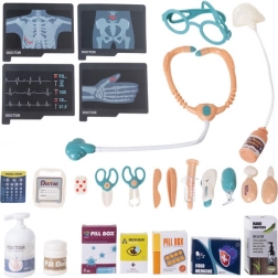 Stéthoscope, thermomètre réglable, seringue, ciseaux, pince, scalpel, miroir, marteau, flacons, « médicaments » et clichés radiographiques/ECG – tout pour les petits médecins.