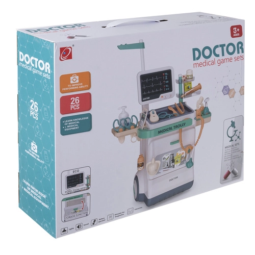 L’emballage comprend 26 pièces dont un stéthoscope, un thermomètre avec réglage de la température, une seringue, un scalpel, une pince, des ciseaux, un marteau neurologique, un miroir et d’autres accessoires. Des compartiments pratiques et des portes offrent un rangement organisé de tous les instruments, toujours à portée. Des matériaux durables et sécurisés sont adaptés aux enfants dès 3 ans.