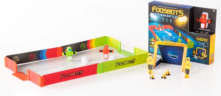 Vivez une action rapide et palpitante avec le set de robo‑football FOOSBOTS de Fat Brain. Le stade de table compact avec rebords, 2 joueurs robotiques et un ballon est complété par un kit d’entraînement avec cible pour des tirs précis. Idéal pour les duels en face‑à‑face, les réflexes rapides et les tournois familiaux partout sur la table.