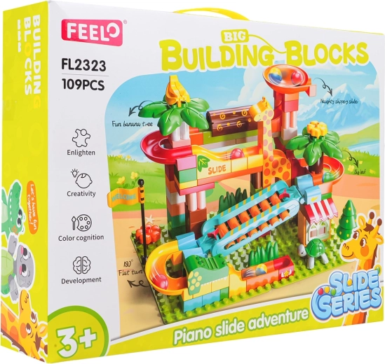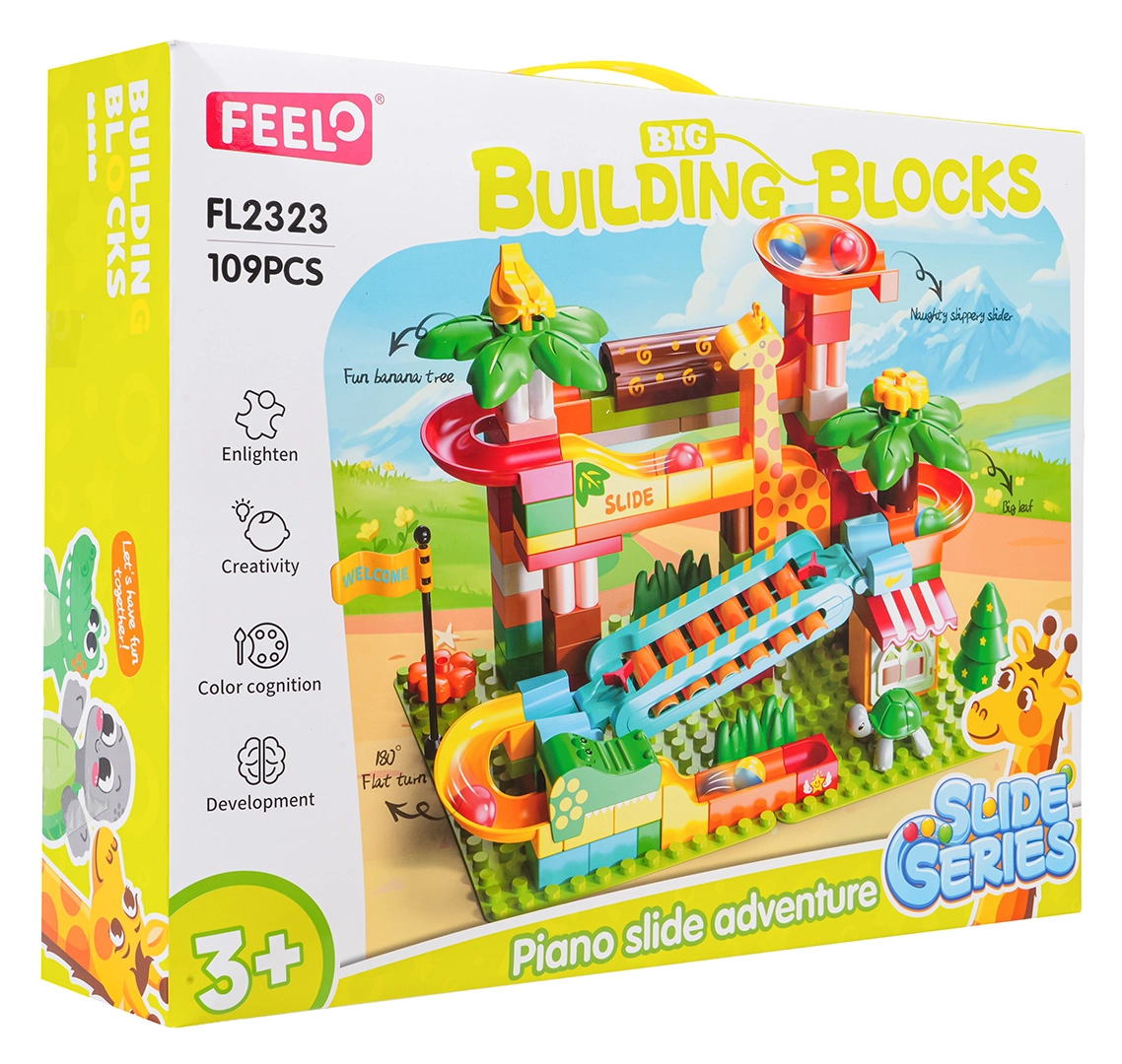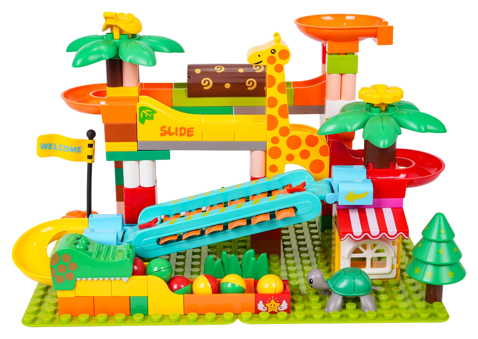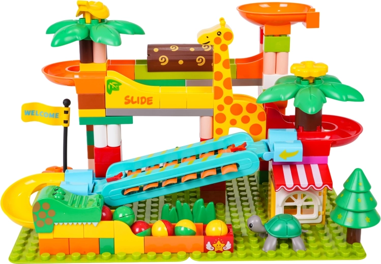 Ce kit de construction créatif apporte une ambiance safari dans la chambre d’enfant : palmiers, animaux et maisonnette sont complétés par une piste à billes ingénieuse avec toboggans, entonnoirs et un élément piano – lorsque les billes passent sur le xylophone, elles créent des mélodies joyeuses. Une base stable et des pièces à encliqueter facilement assurent une construction et un jeu agréables.
